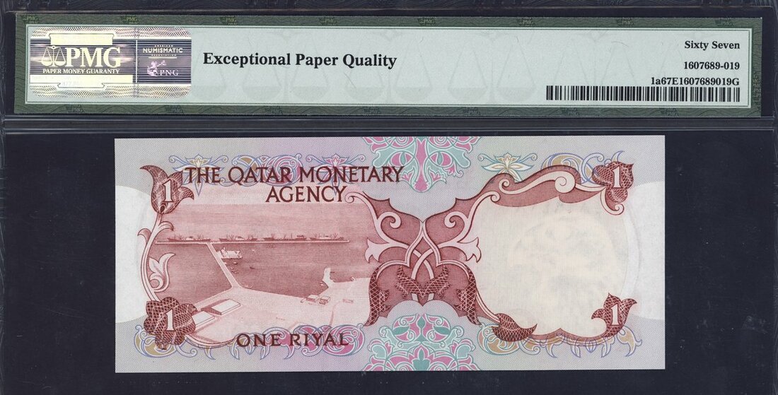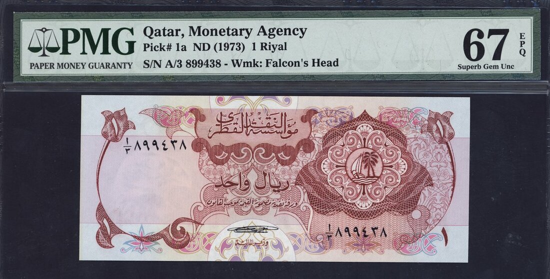 (x) Qatar Monetary Agency, 1 riyal, ND (1973), purple-brown, arms at right, signature of Abdulaziz al-Thani