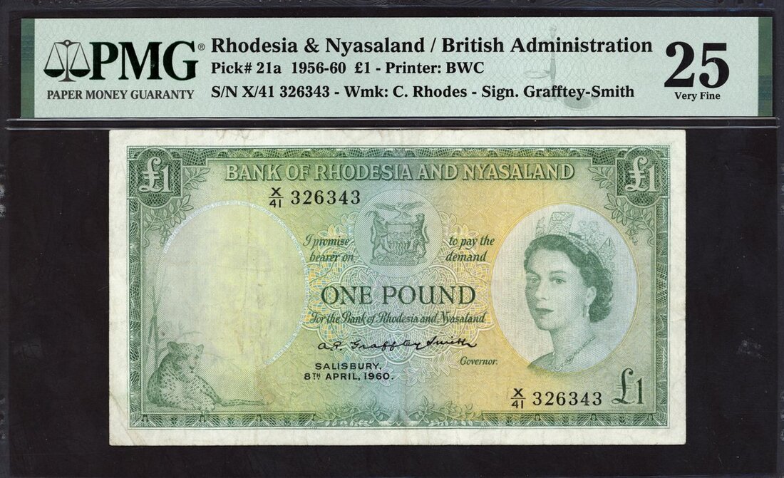 Bank of Rhodesia and Nyasaland, £1, 8th April 1960, serial number X/41 326343, (Pick 21a, TBB B102a41), in PMG holder 25 Very Fine