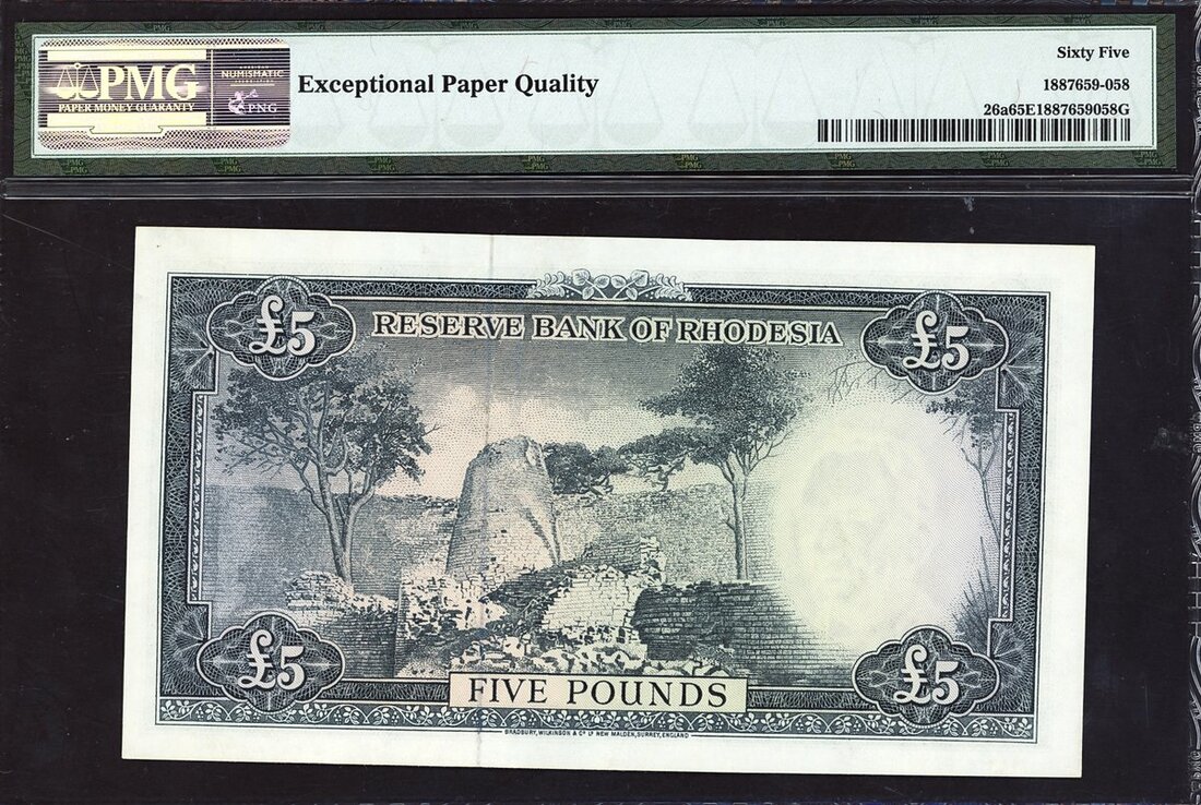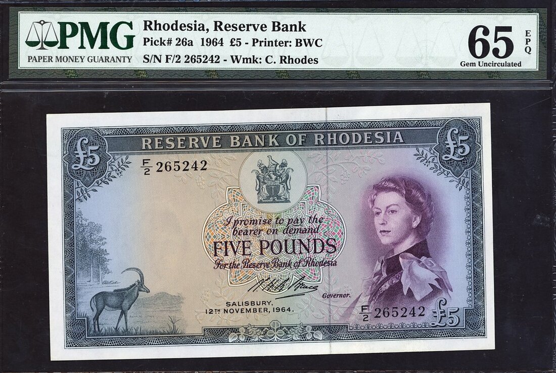 (x) Reserve Bank of Rhodesia, £5, Salisbury, 16 November 1964, prefix F/2, blue, portrait of Queen Elizabeth II at right, arms top centre