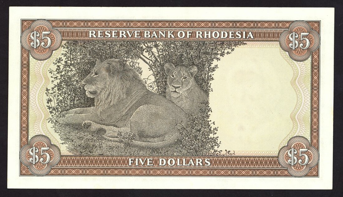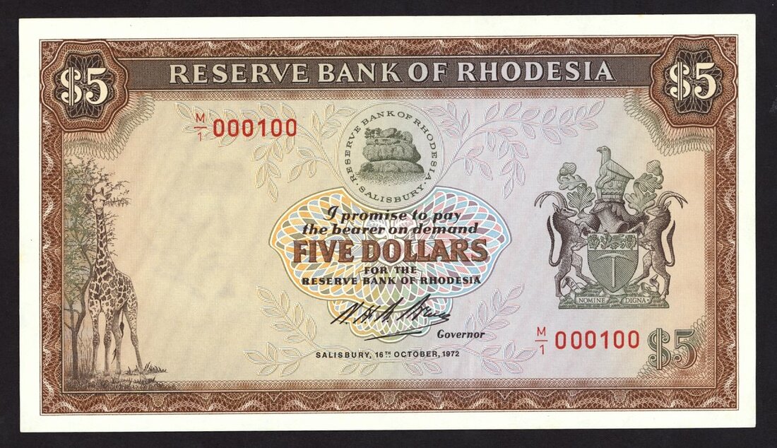Reserve Bank of Rhodesia, $5, Salisbury, 14 October 1972, red serial number M/1 000100, brown and multicoloured, giraffe at left, arms at right, Bruce signature, Rhodes watermark