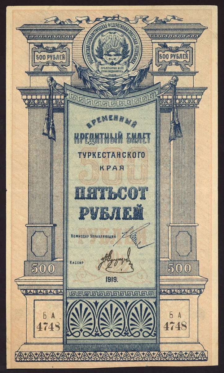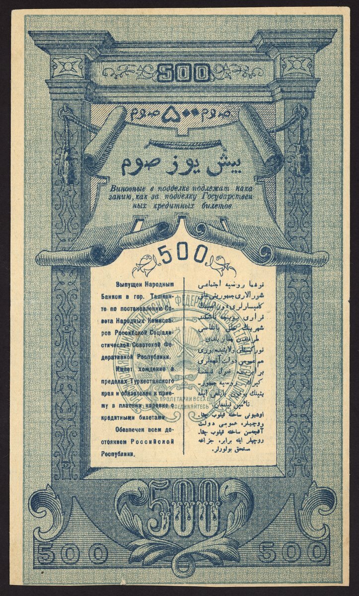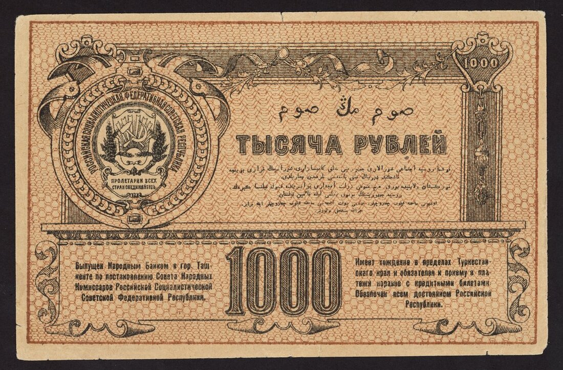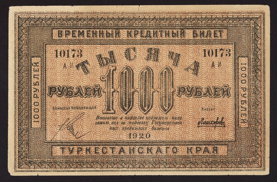 (x) Turkestan District, Russia, 500, 1000 rubles, 1919, 1920, (Pick S1172, S1173), the 500 rubles quite scarce, extremely fine, 1000 rubles with minor splits, very fine (2 notes)