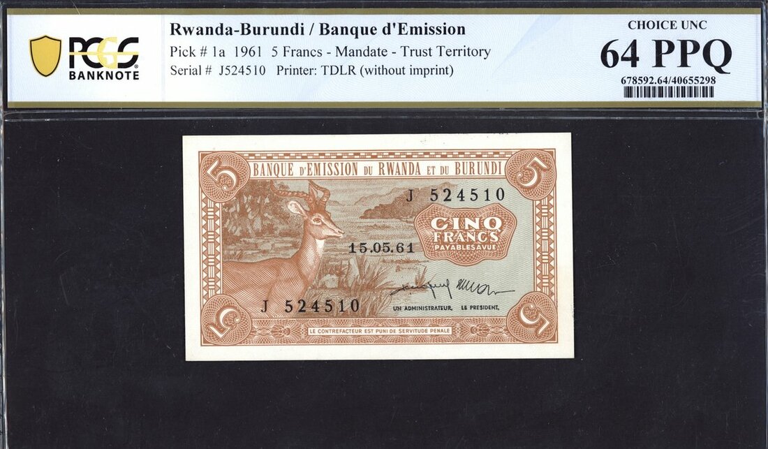 (x) Banque d'emission du Rwanda et du Burundi, 5 francs, 15.05.1961, serial number J524510, (Pick 1a, TBB B101b), in PCGS Banknote holder 64 PPQ Choice Uncirculated, first banknote to replace Belgian Congo franc, scarce