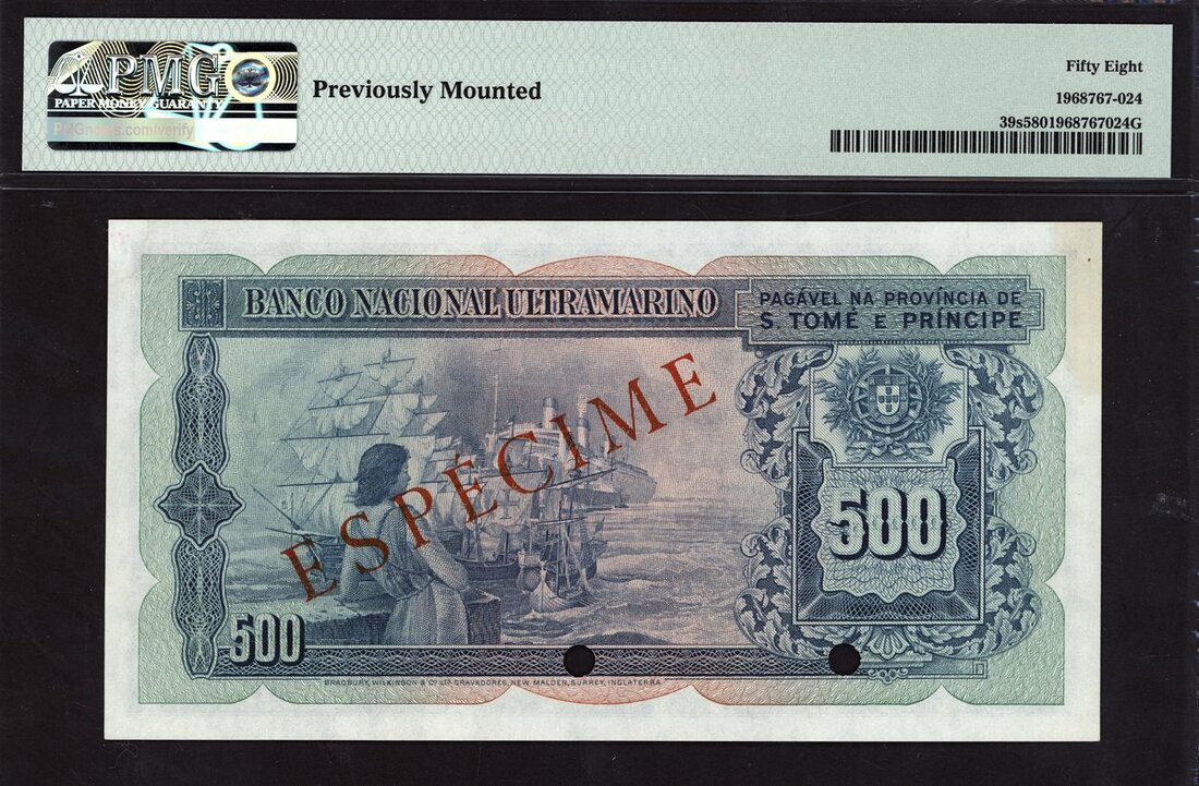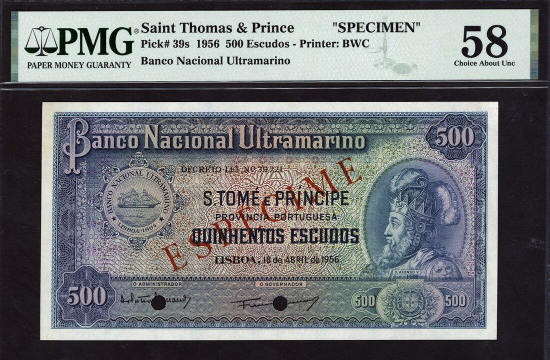 Saint Thomas and Prince, specimen 500 escudos, 18 April 1956, (Pick 39s, in PMG holder 58 Choice About Uncirculated, previously