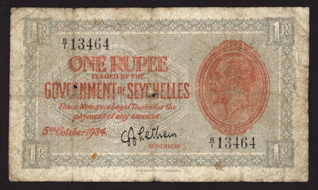 Government of the Seychelles, 1 rupee, 5 October 1934, serial number B/1 13464, red and grey, head of George V at right, Lethem signature