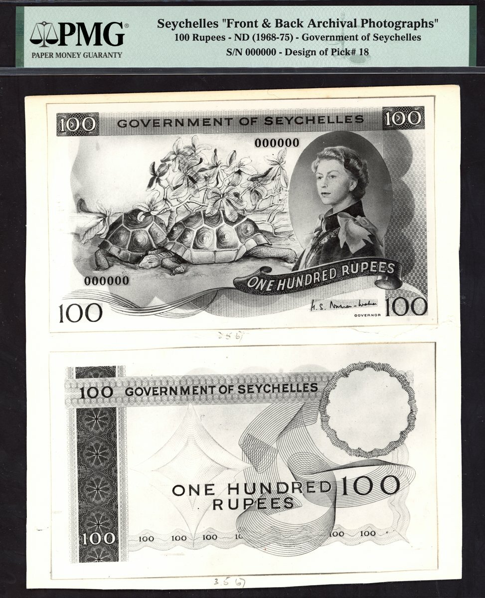 (x) Government of Seychelles, obverse and reverse photograph for a 100 rupees, ND (1968-75), (Pick 18 for type, TBB B125), mounted on card, pencil annotation '3.5.67' on card, in PMG holder, interesting