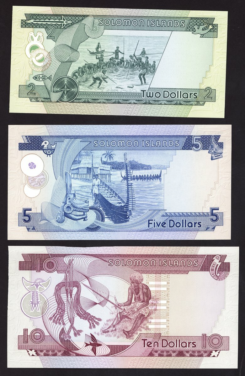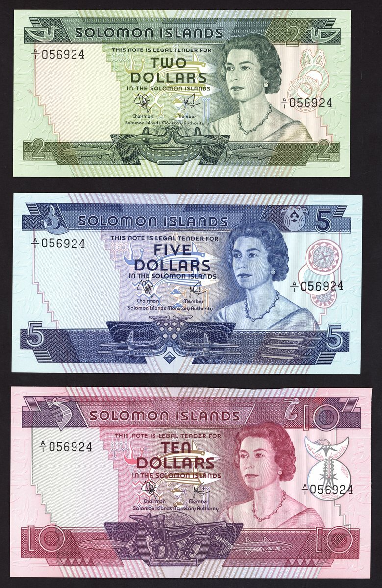 Solomon Islands, same serial number A/1 056924 set for 2, 5, 10 dollars, (Pick 5, 6, 7, TBB B101a, B102a, B103a), first issued series for Independent Solomon Islands, crisp uncirculated (3 notes)