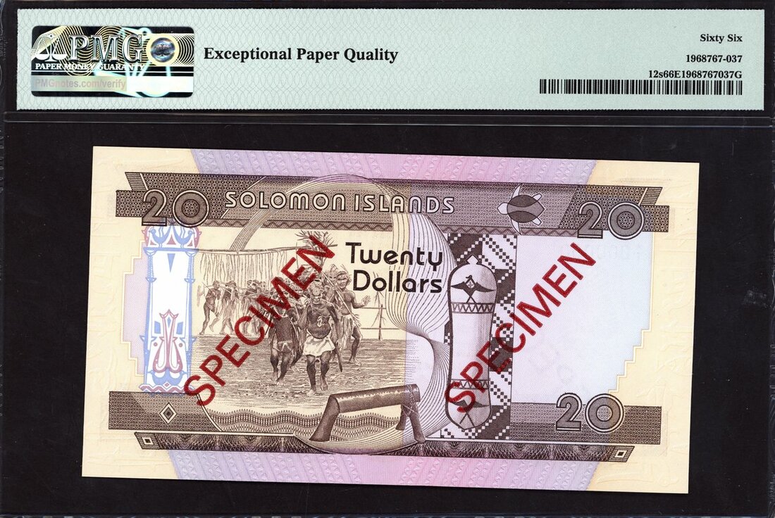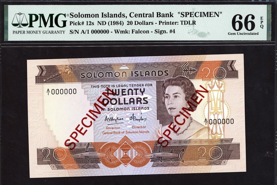 Central Bank of The Solomon Islands, specimen 20 dollars, ND (1984), prefix A/1 (Pick 12s, TBB B202s), actual bank specimens and not to be confused with Franklin Mint specimens, in PMG holder 66 EPQ Gem Uncirculated, scarce