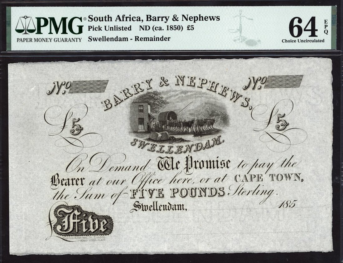 South Africa, Barry & Nephews, £5, ND (ca. 1850), (Pick Unlisted), in PMG holder, 64 EPQ Choice Uncirculated