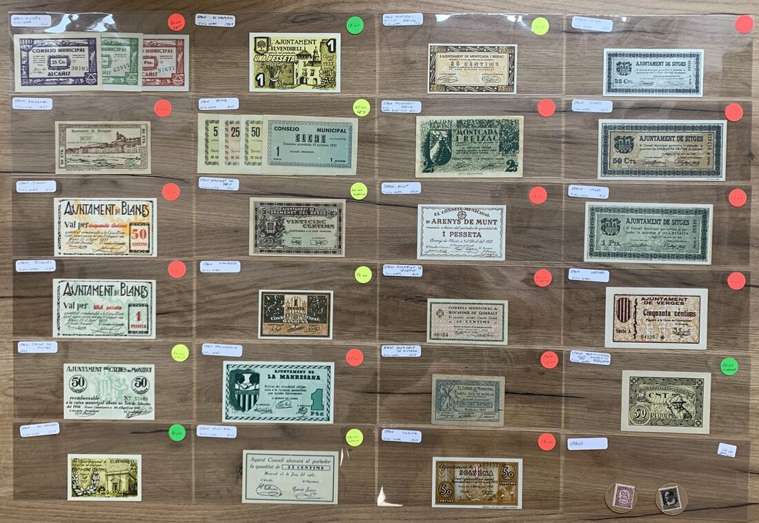 (x) Spanish Civil War issues, 1937, a group of local currency, including Alcaniz (3), Balaguer, Blanes (2), Caldes de Montbui, El Vendrell (2), Elche (4), Gramenet del Besos, Manresa, Manresana, Mon-ral, Montcada (2), Munt, Rocafort, Santa Cruz, Solsona, Stiges (3), Verges, also 3 tokens,
