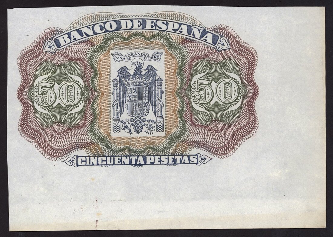 Banco de Espana, unissued reverse proof of 50 pesetas, ND (1906)?, some handling at margins, about uncirculated