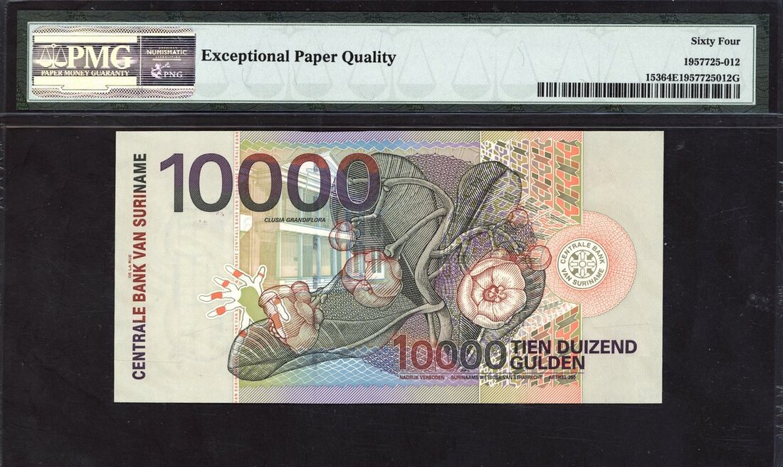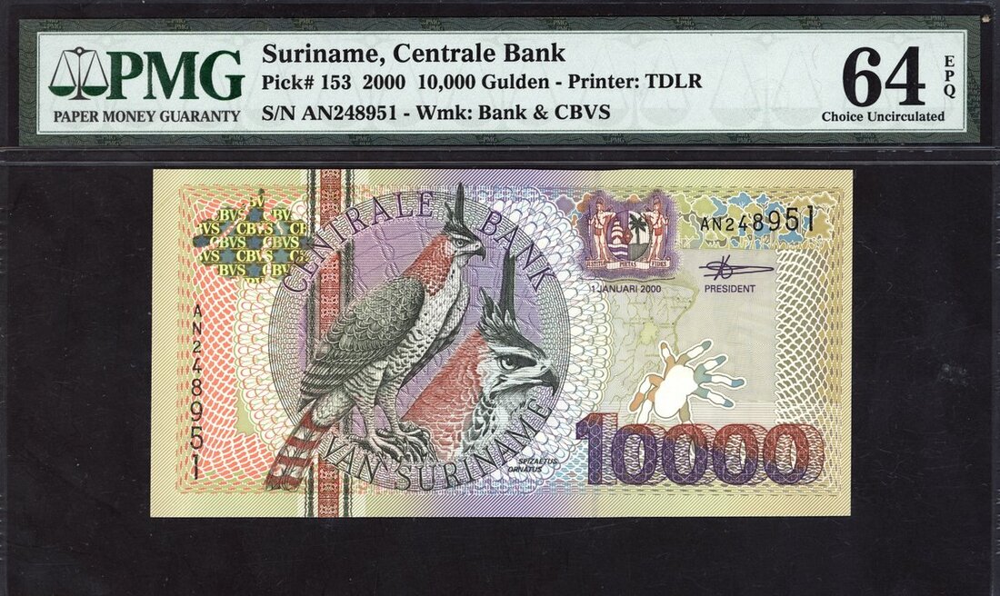 (x) Centrale Bank, Suriname, 10000 gulden, 2000, prefix AN, purple and multicoloured, ornate hawk-eagle at left, arms top right