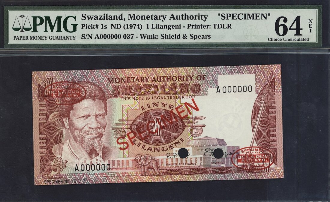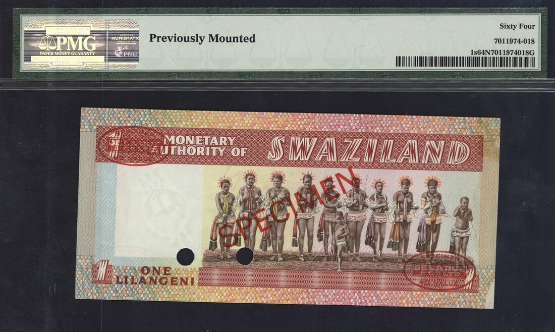 Monetary Authority of Swaziland, specimen 1 Lilangeni, ND (1974), (Pick 1s), in PMG holder 64 NET Choice Uncirculated, previously mounted