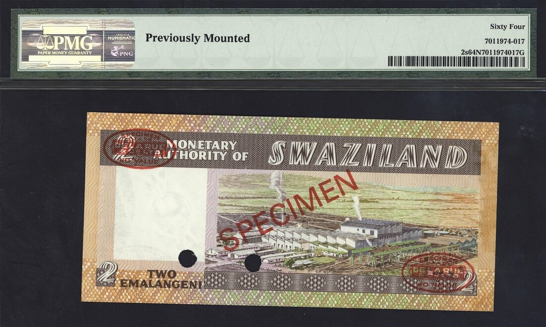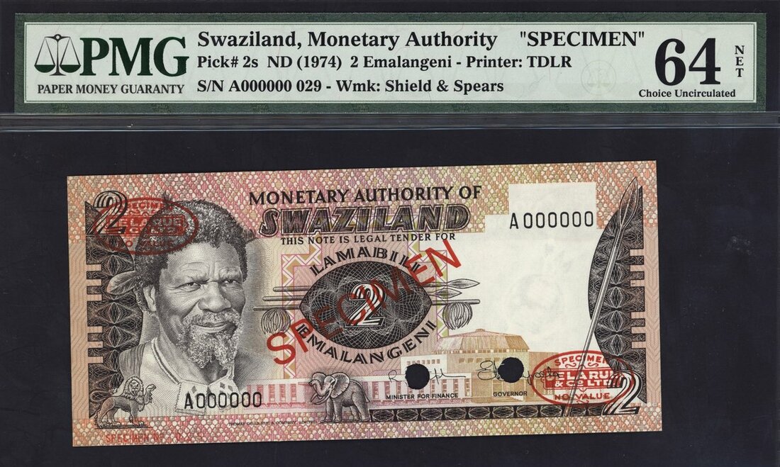 Monetary Authority of Swaziland, specimen 2 Emalangeni, ND (1974), (Pick 2s), in PMG holder 64 NET Choice Uncirculated, previously mounted