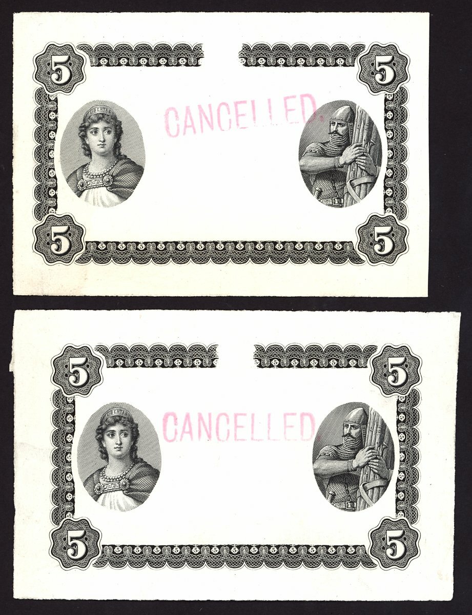 (Pick 14-16, TBB B101-103 for similar), CANCELLED overprint, glue stains on reverse, one has a slight tear at lower left, engraved, beautiful and rare (2 items)