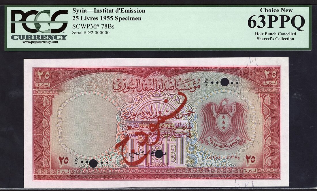 (x) Institut d’Emission de Syrie, specimen 25 livres, 1955, prefix D/2 (Pick 78Bs, TBB B504Bs), hole punch cancelled, in PCGS holder 63 PPQ Choice New, scarce