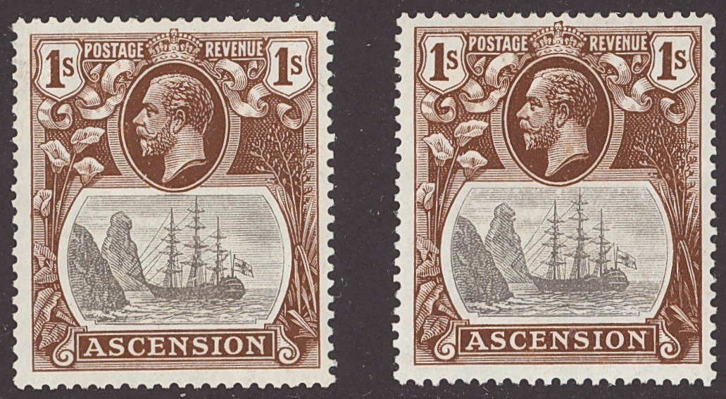 1924-33 1/- grey-black and brown (2), the first with variety broken mainmast and the second with cleft rock; both lightly mounted mint. S.G. 18a, 18c, £775