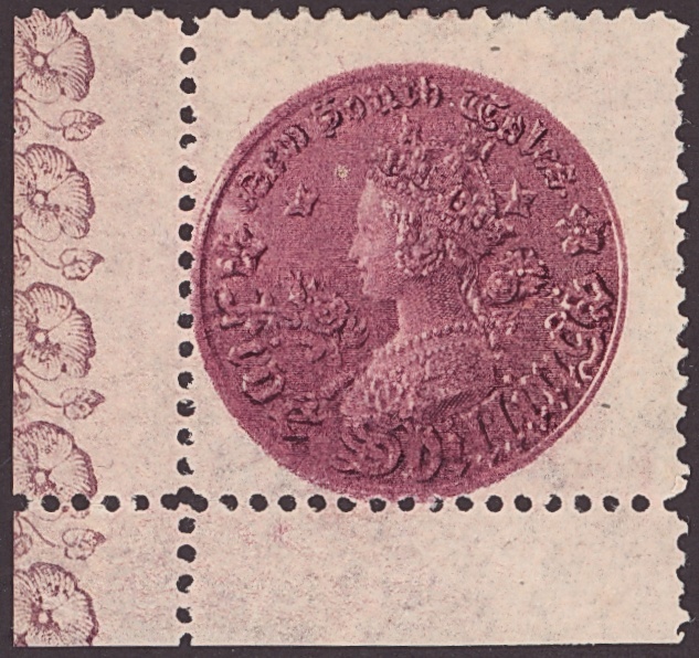 1897 Coin 5/- reddish purple, perf 12, a lower left corner example with convolvulus flowers at edge of left margin, fine mint. B.P.A. Certificate (2010). S.G. 297cd