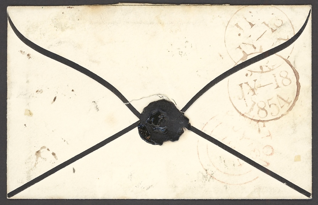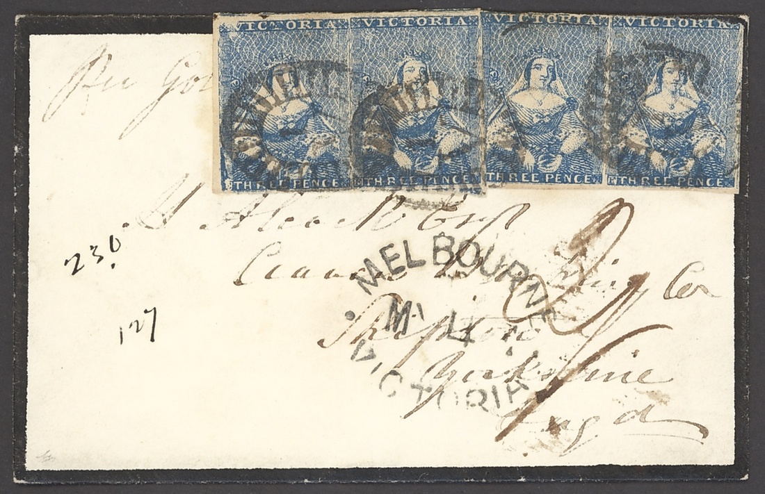 1854 (4 May) mourning envelope from Melbourne to Yorkshire via Panama, marked "Per Golden Age", bearing Half-Length 1853 4th printing "white veils" 3d. deep blue pairs (2) with the left stamp of the left pair showing spectacular retouch completely obliterating the corner