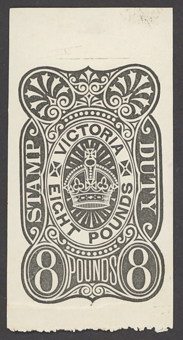 1884-96 Stamp Duty £8 die proof in black on unwatermarked wove paper (34x65mm.), light horizontal crease in lower surround but a rare and beautiful item, one of only five die proofs known for this value, all of which are in different states, this example showing the completed crown but lacking the