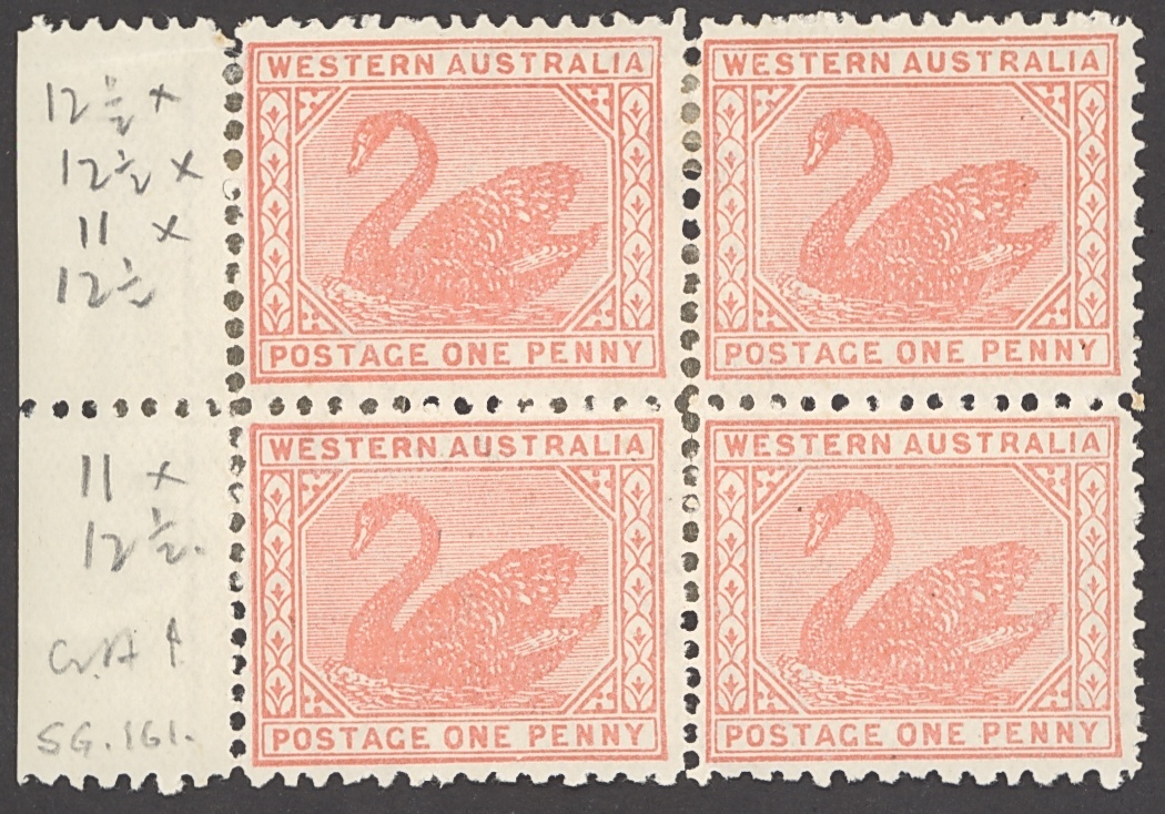 1905-12 compound perf. 12½ x 11 1d. rose-pink, a block of four from the left of the sheet, some perf. reinforcement in places and pencil notations in the margin, part original gum; fine and rare. S.G. 161, £4,800+