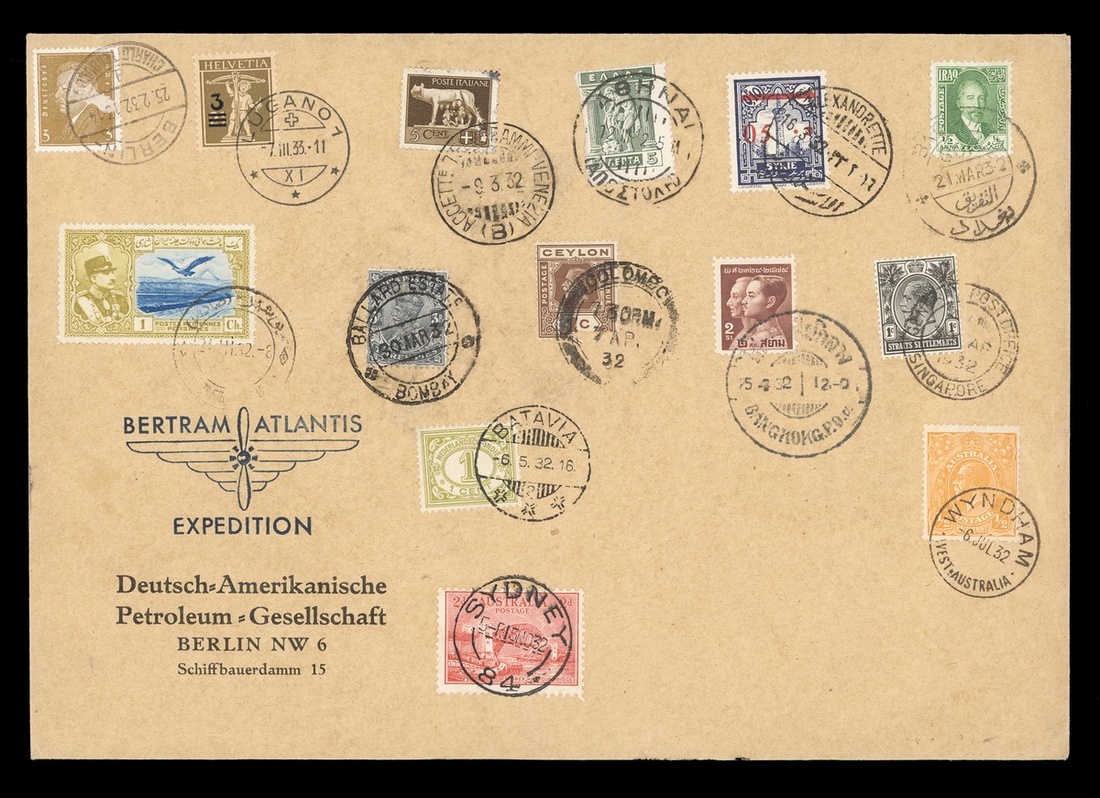 1932 (Feb.-Nov.) Bertram Atlantis Expedition, souvenir cover bearing stamps of Germany (a little rubbed), Switzerland, Italy, Greece, Syria, Iraq, Iran, India, Ceylon, Thailand, Straits Settlements, Netherlands Indies and Australia, each appropriatley cancelled in transit; fine and scarce