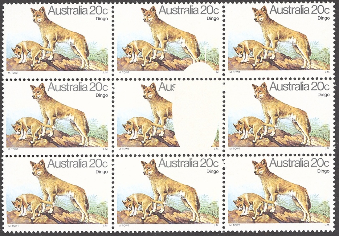 1980 20c. 'Dingo', a block of nine with striking central plate flaw resulting in two stamps with green virtually omitted, fine unmounted mint. S.G. 729 var.