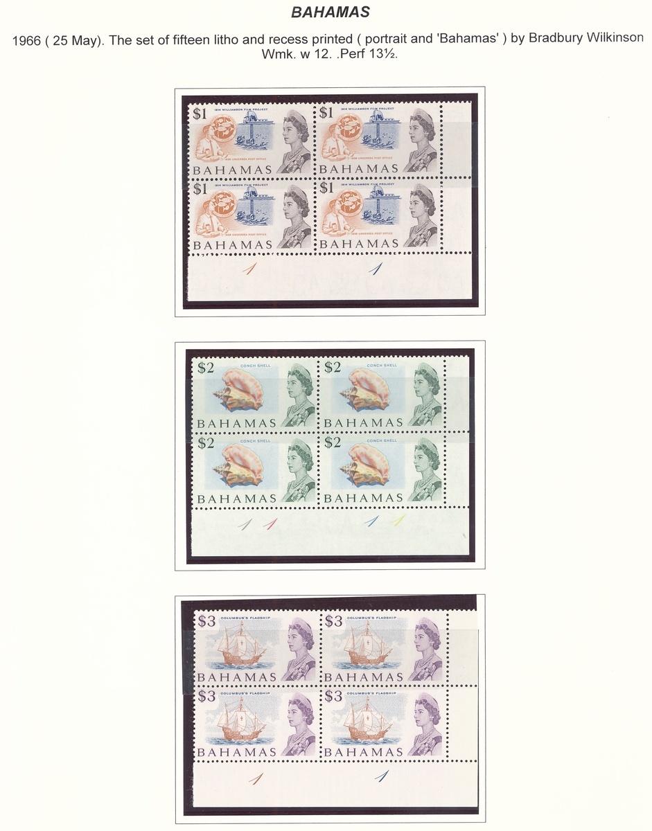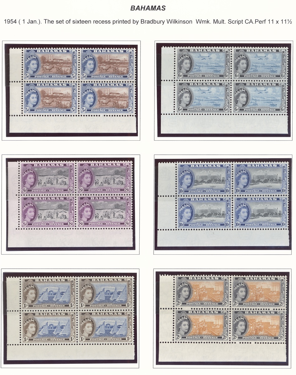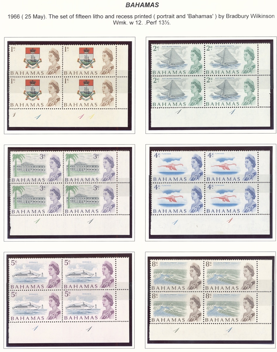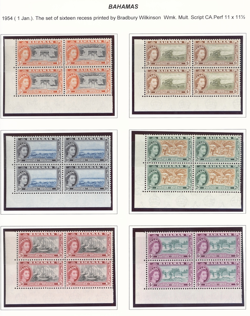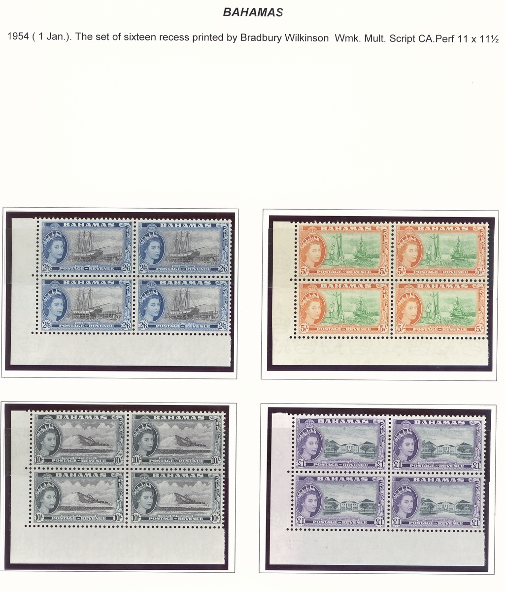 1954 (1 Jan.) ½d. to £1 set of sixteen in corner blocks of four and 1967 (25 May) 1c. to $3 set of fifteen in corner blocks of four with plate number