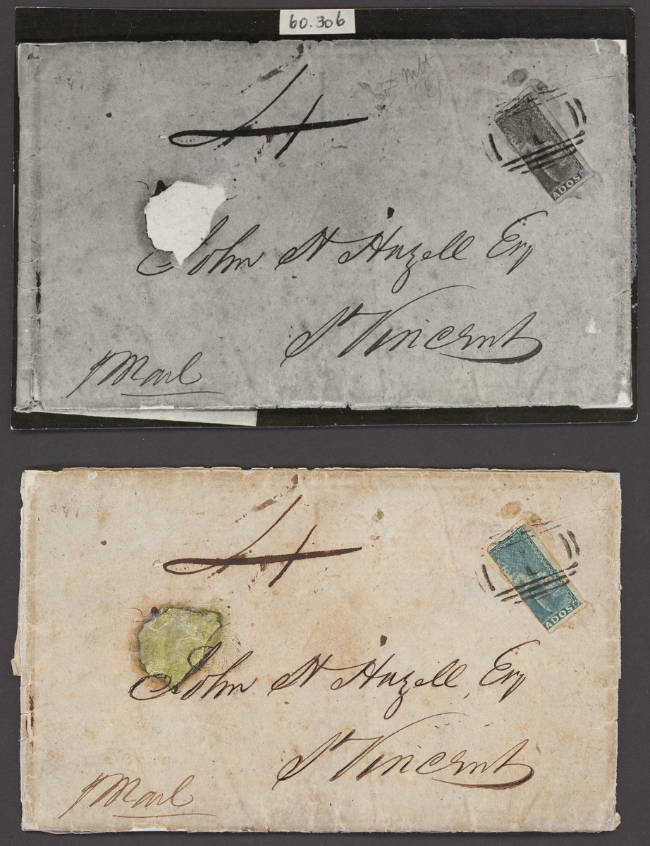 1852-55 (2d.) greyish slate, vertical bisect (right hand portion), tied by "1" barred oval cancellation to 1854 (5 Sept.) long entire letter, with contents, to St. Vincent, showing manuscript "4" at left; a little stained around the edges, faults including a backed up hole to the front of the entire. R.P.S. Certificate (1966 and 2011). S.G. 4b, £8,500