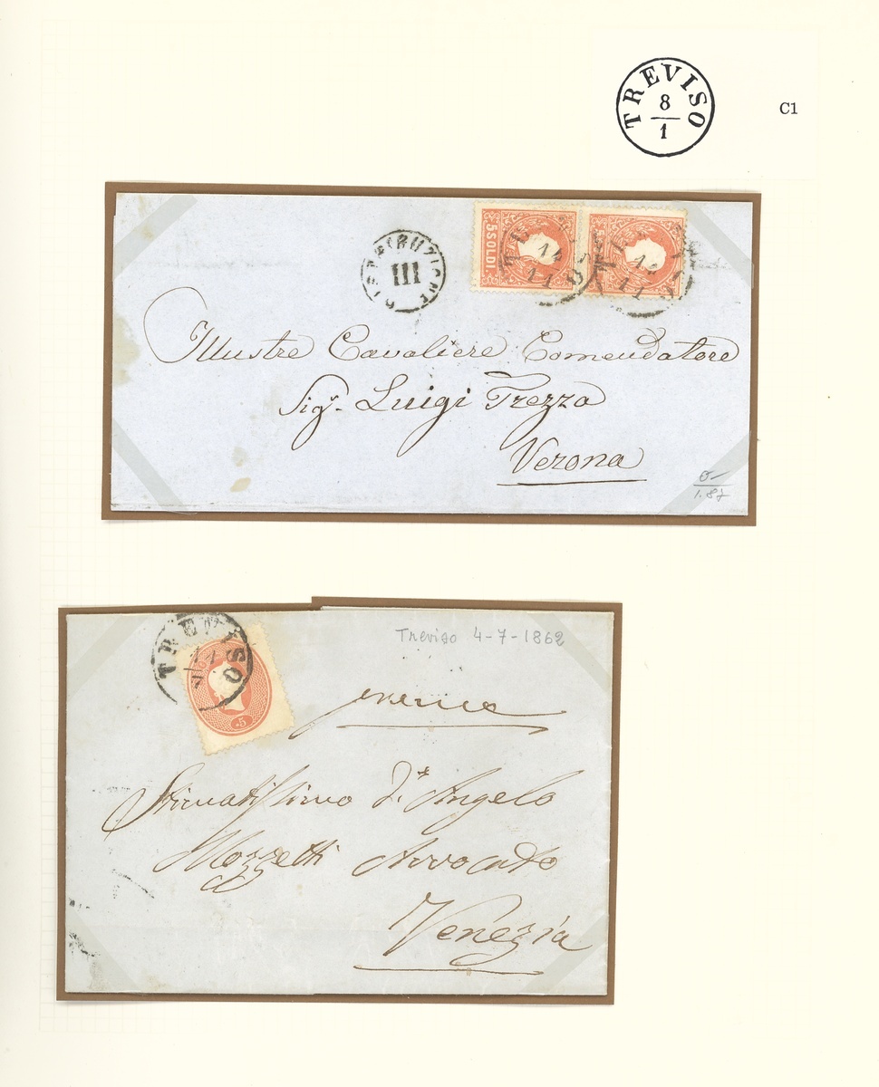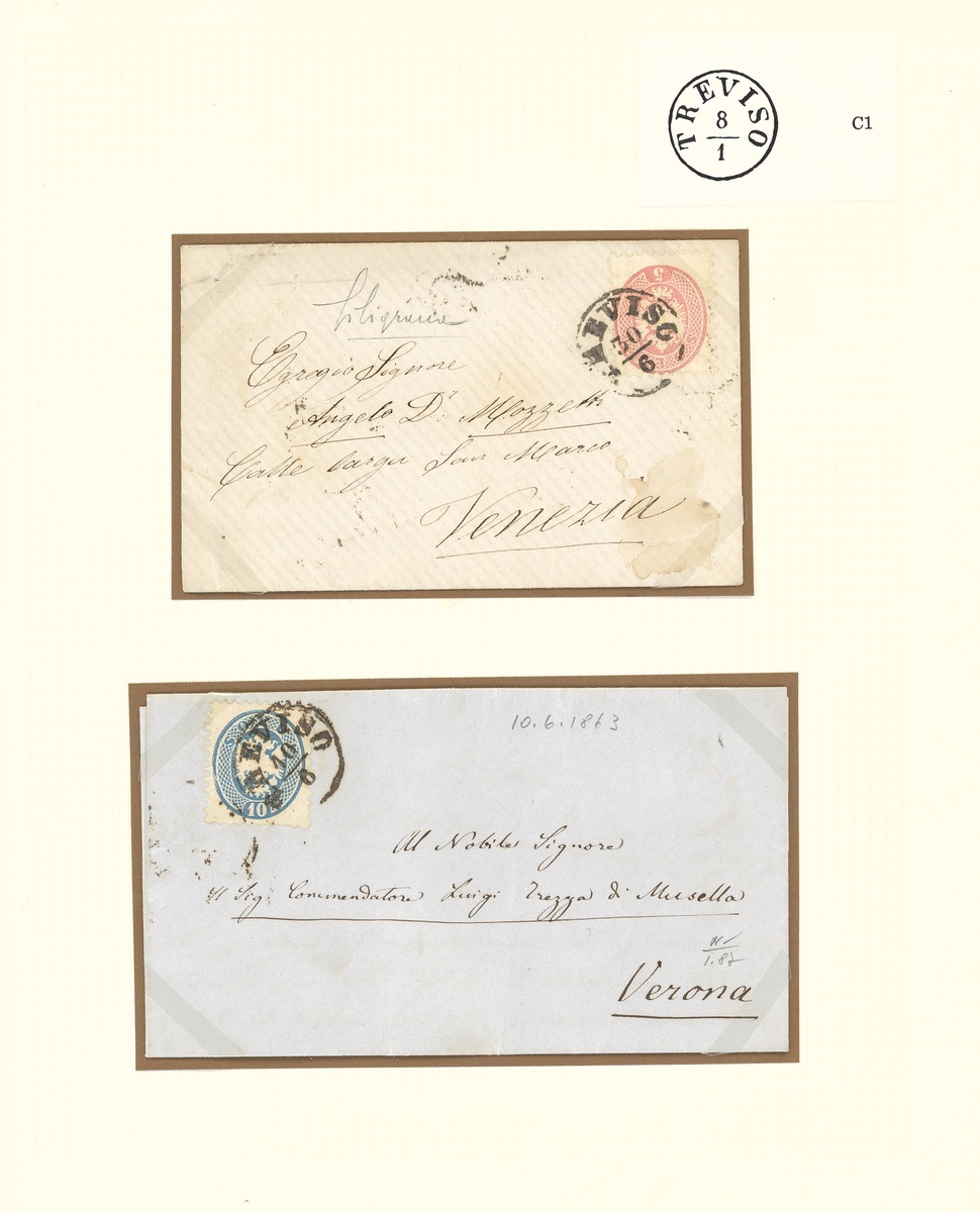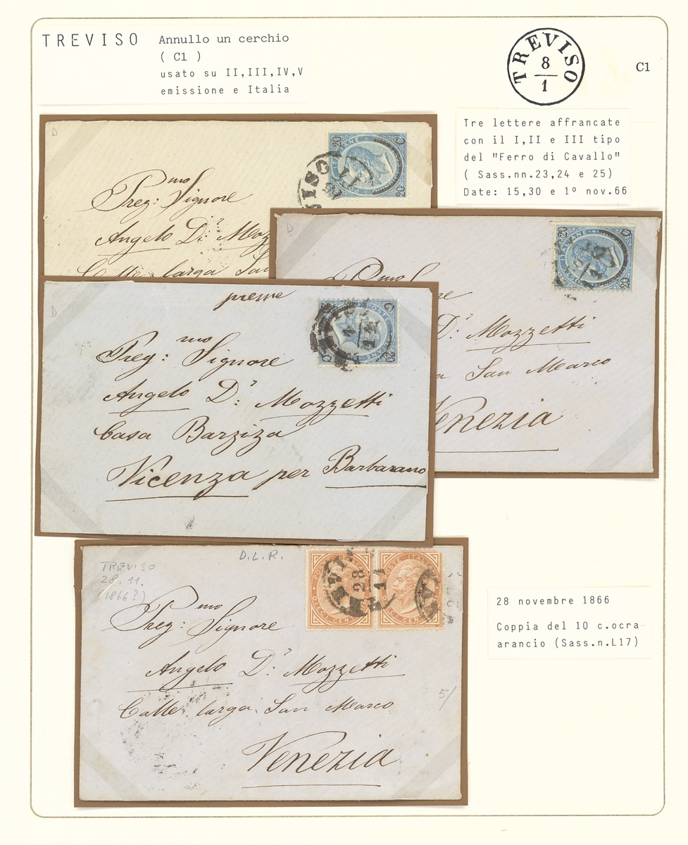 1852-1866 "Rovigo" postal history selection (9) arranged on well written album pages including 1852 30c. (Sassone 7) on cover addressed to "Verona" cancelled by Rovigo (SI/2) cancel and with alongside "Distribuzione 1" cancel; Kingdom 1865 20c. on 15 "Ferro di cavallo", the three types on three different covers cancelled by Treviso (C1) cancels. A good group for the specialist