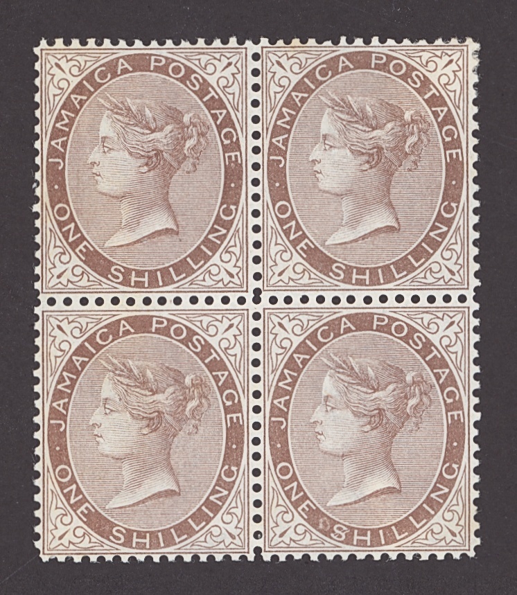 1870-83 CC 1/- dull brown block of four, the lower right stamp with variety "$" for "