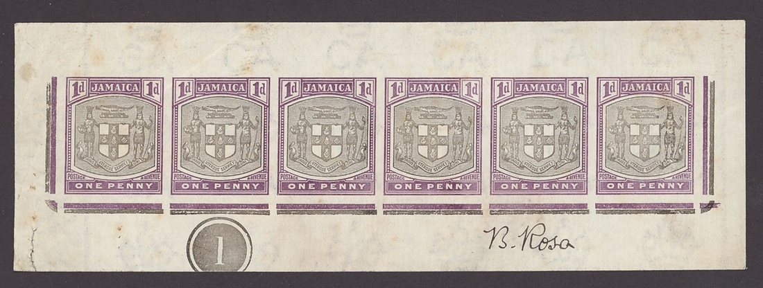 1903-04 Arms, 1d. colour trial miniature sheet strip of six in grey-brown and deep plum showing Jubilee lines for both colours and plate number "1" in grey-brown, and with frame colour marked "B Rosa"; left-hand stamp creased and some foxing mainly confined to reverse. A very rare sheet