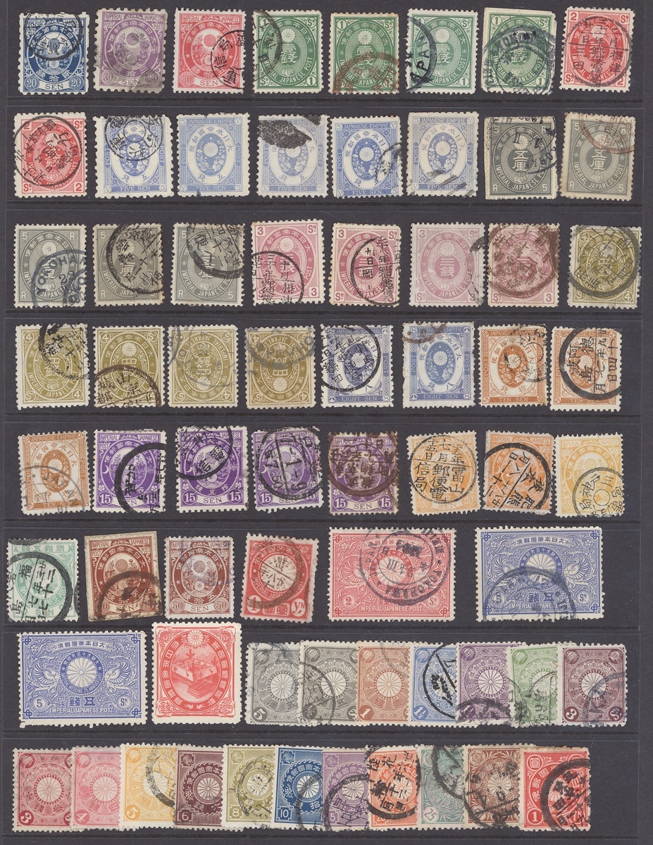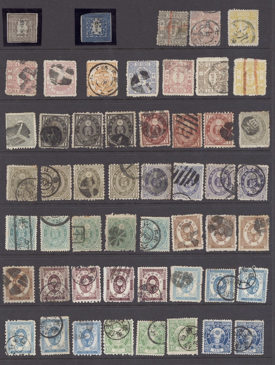 1871-1907 mint and mostly used selection of genuine Dragon, Cherry Blossom and Kobans arranged on two Hagner pages including 1871 48m. plate 1 pos. 12 mint , 100m. plate 1 pos. 18 mint, 1873 4 sen used, range of duplicated Kobans with different shades and cancels, mixed condition. (118)