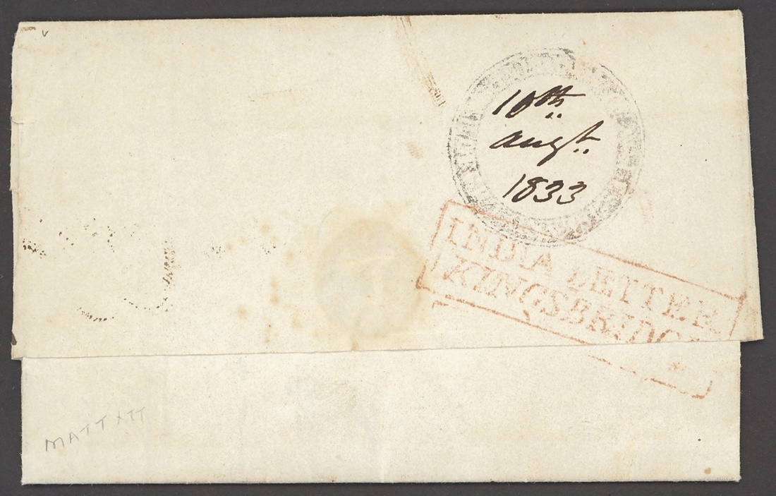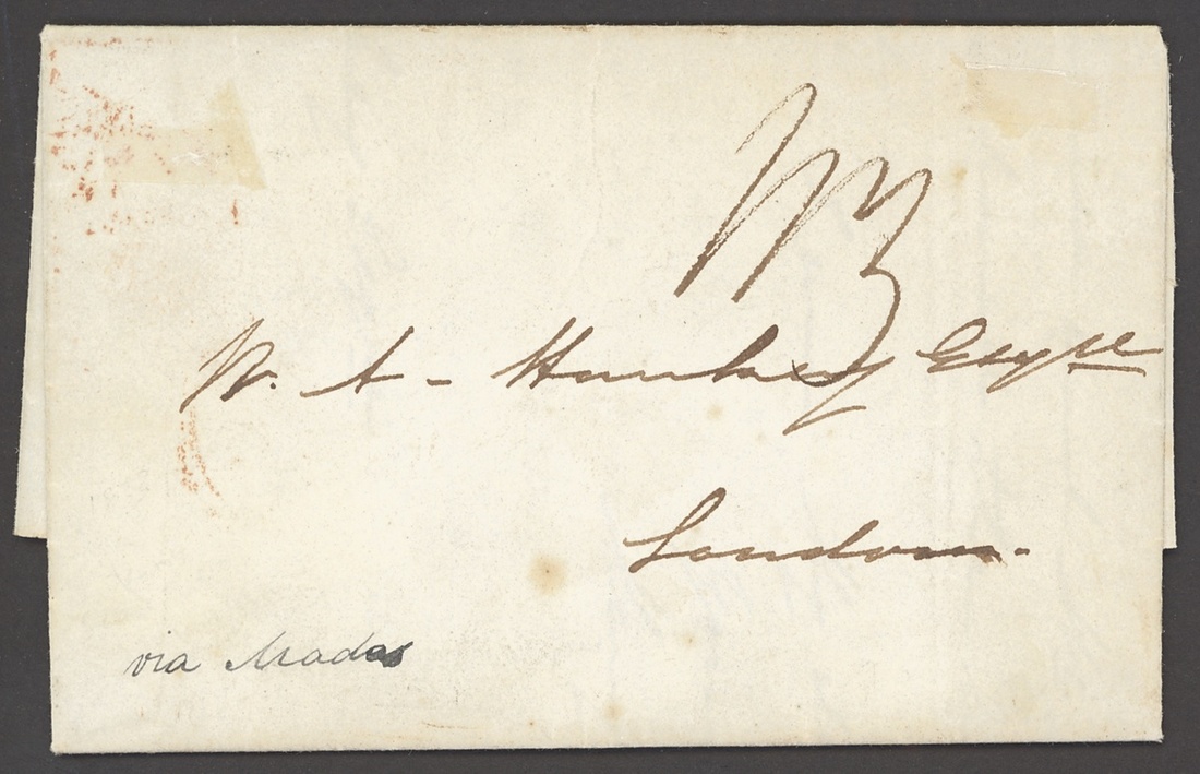 1833 (10 Aug.) entire letter to London, marked "via Madras", rated "1/3" and showing, on reverse, circular intaglio