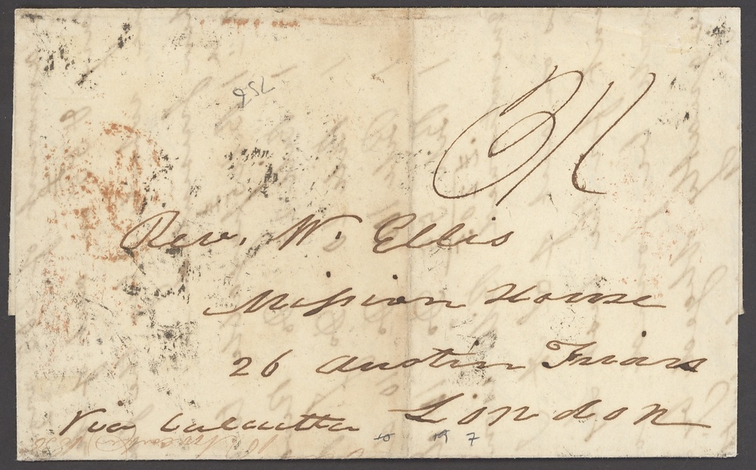1835 (3 Apr.) entire letter to London, marked "Via Calcutta", rated "3/1" and showing, on reverse, a good strike of