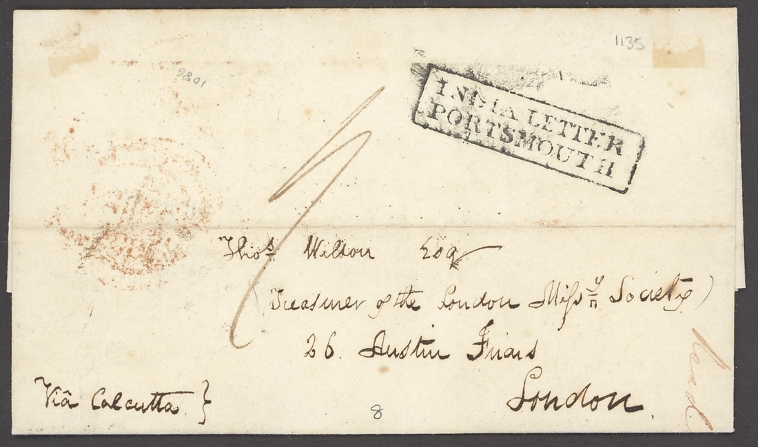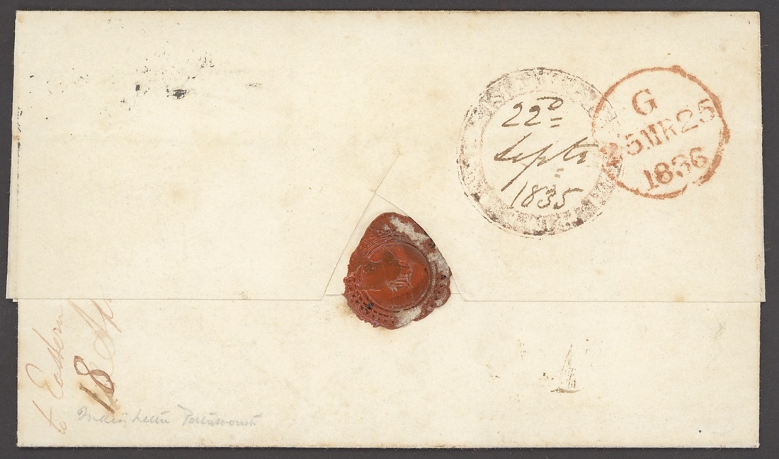 1835 (22 Sept.) entire to London, marked "Via Calcutta", rated "1/-" and showing, on reverse, a good strike of