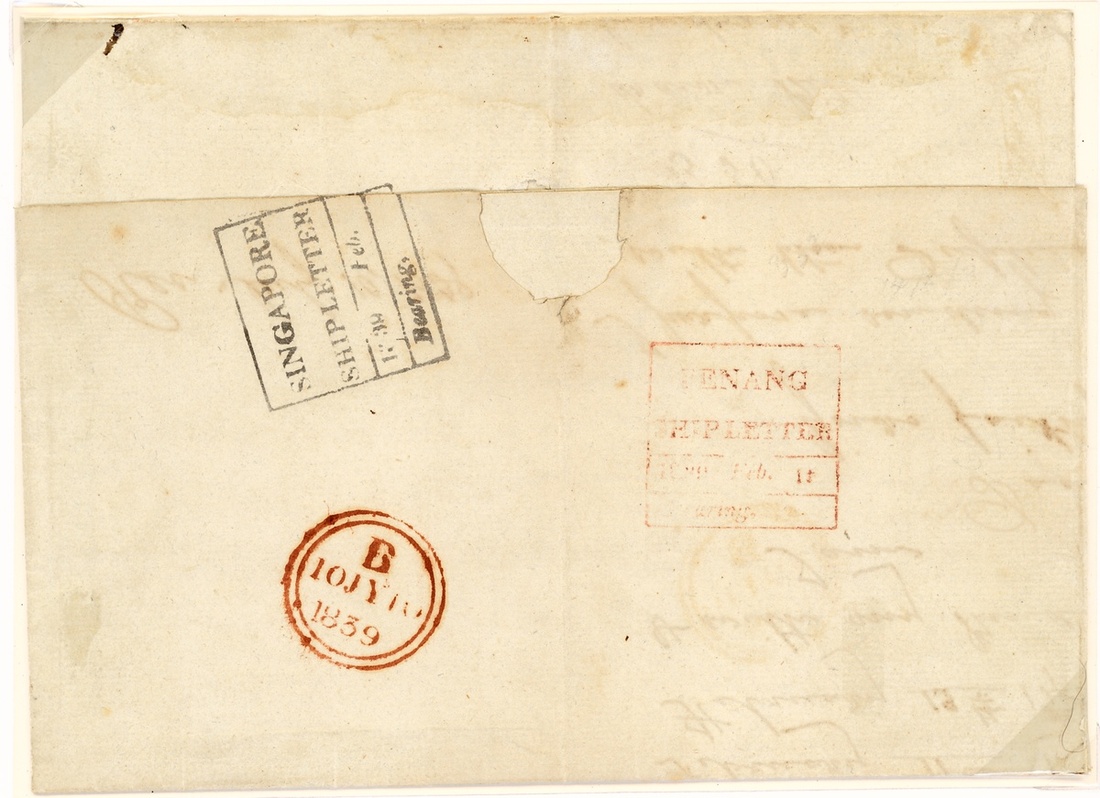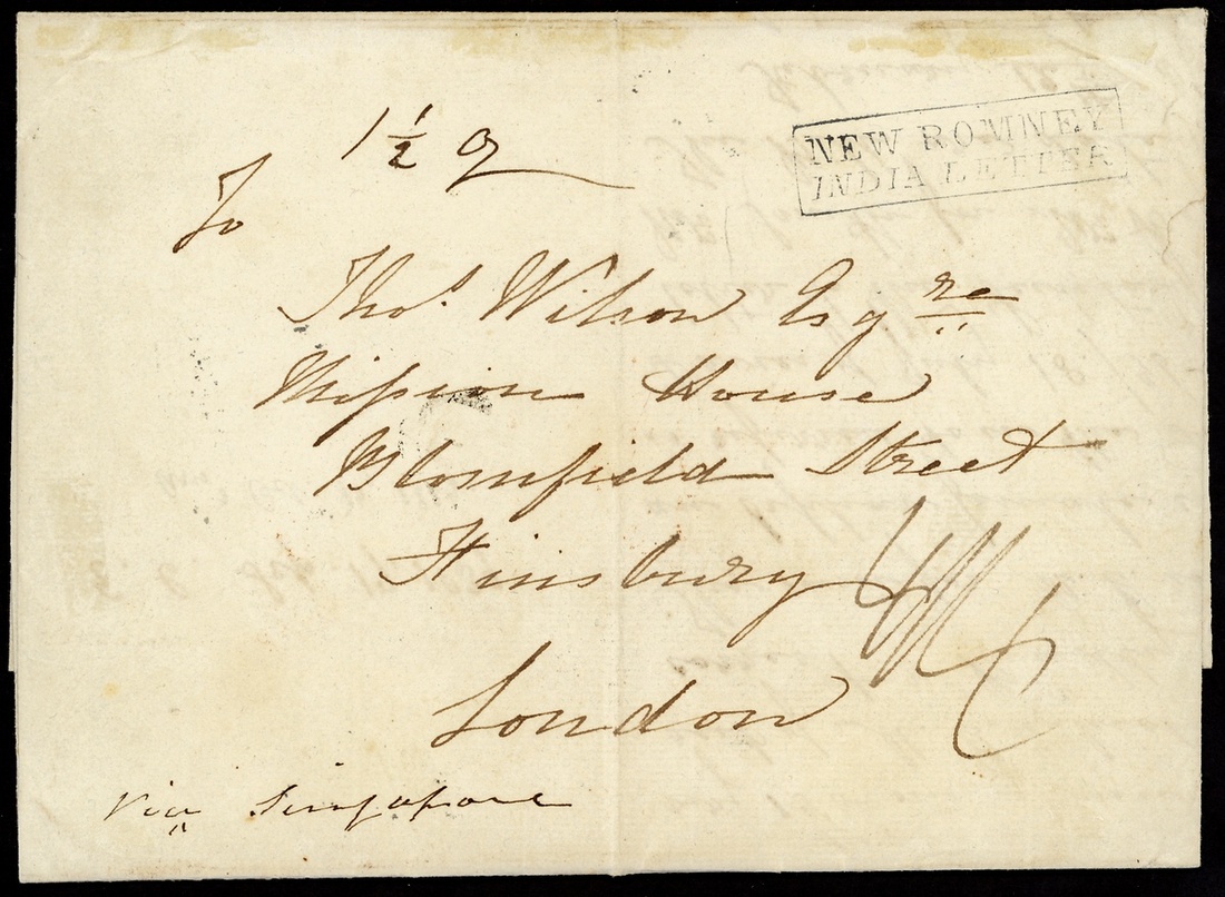 1839 (19 Feb.) entire letter to London, marked "Via Singapore" and "1½oz", rated "4/6" and showing, on reverse, good to fine boxed