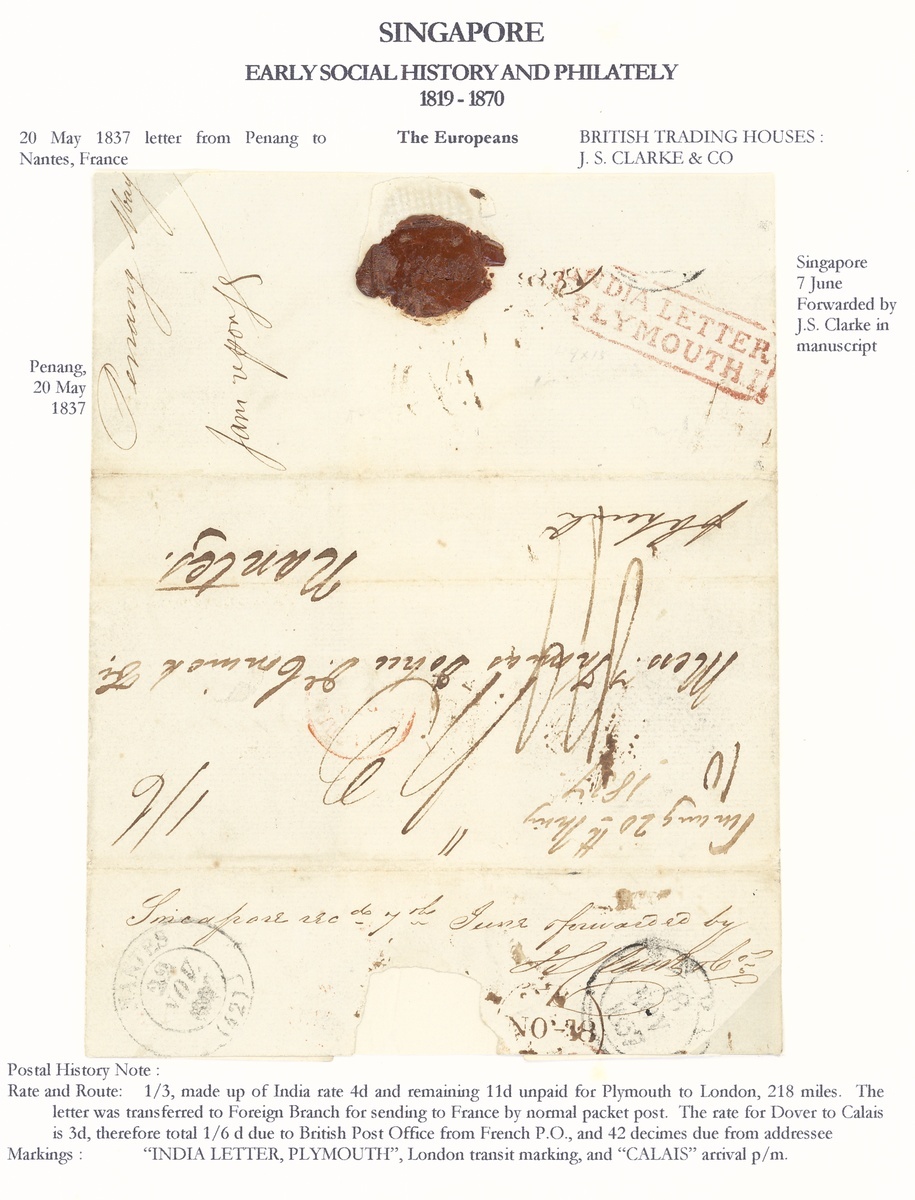 1839 (20 May) entire to Nantes, rated "1/3" and "1/6" and showing, on reverse, manuscript "Singapore recd 7th June and forwarded by J.S. Clarke & Co.", framed