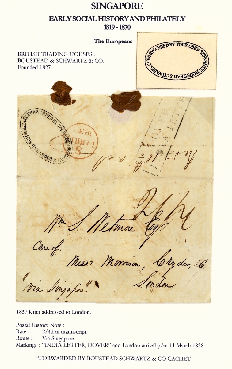 1837 (5 Sept.) entire to London, marked "Via Singapore", rated "2/4" and showing, on reverse, large oval