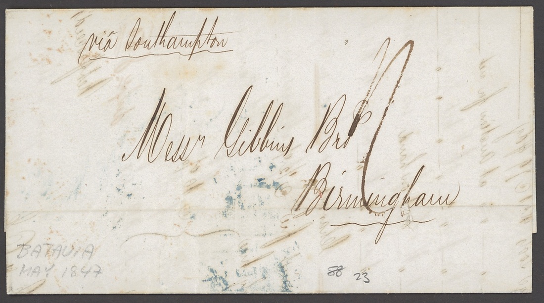 1847 (25 May) entire letter from Batavia to Birmingham, marked "via Southampton", rated "1/-" and showing, on reverse,