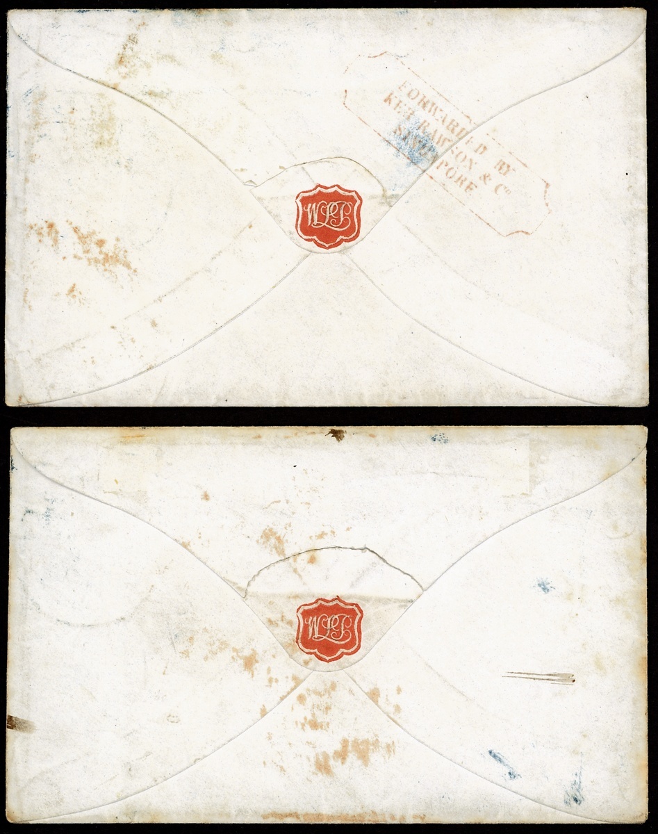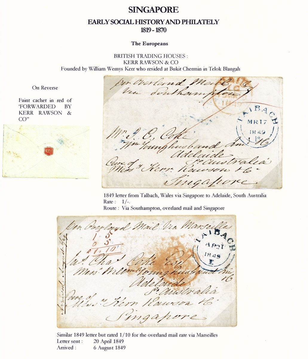 1849 (17 Mar.) and (21 Apr.) envelopes (the former with letter) ex the same correspondence from Wales to Adelaide, South Australia care of Kerr Rawson & Co., Singapore, the former marked "per overland mail via Southampton", rated "1/-" and showing framed