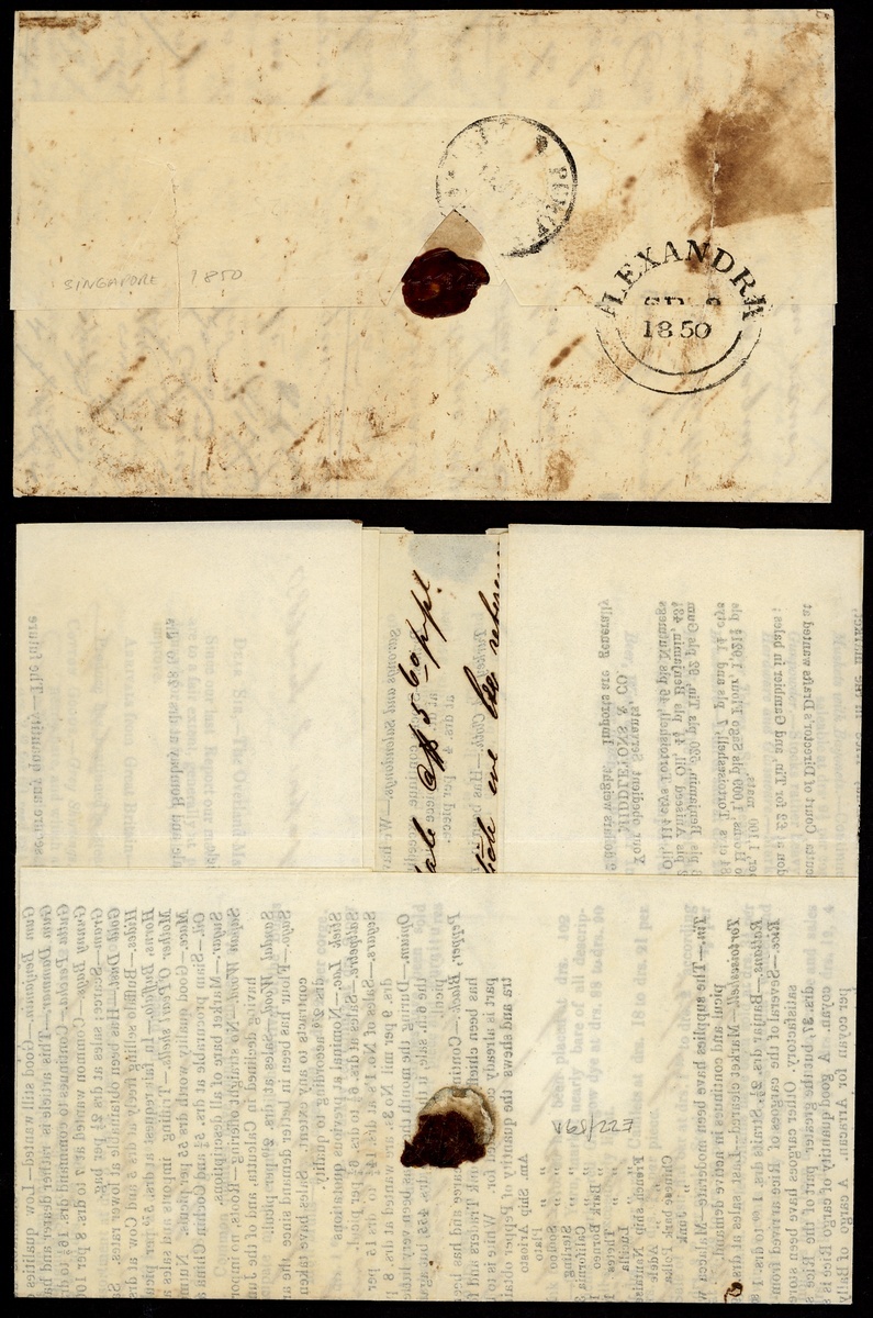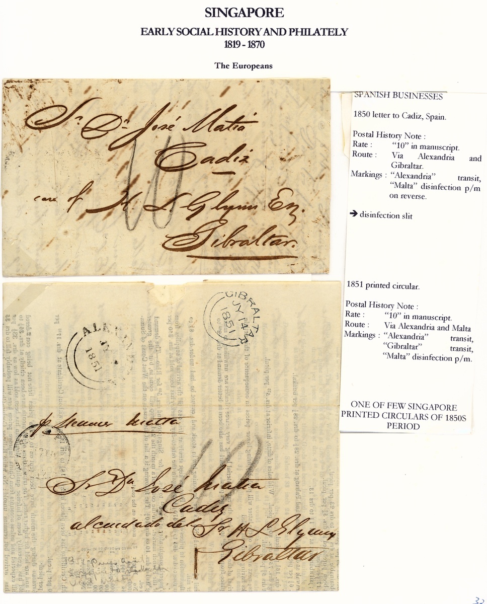 1850 (3 Aug.) entire letter with disinfection slits and 1851 (2 June) printed circular, both ex the Matia correspondence to Cadiz via Gibraltar, the former showing Alexandria British P.O. transit d.s. (9.9) and