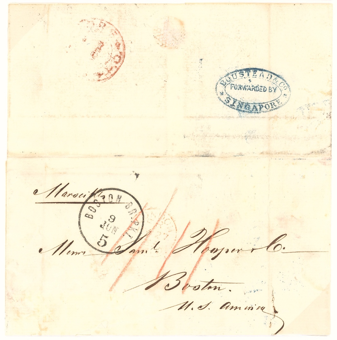 1865 (15 Apr.) entire from Hong Kong to Boston, USA, marked "Marseilles", showing red crayon "1/11" with, on reverse, double-lined oval