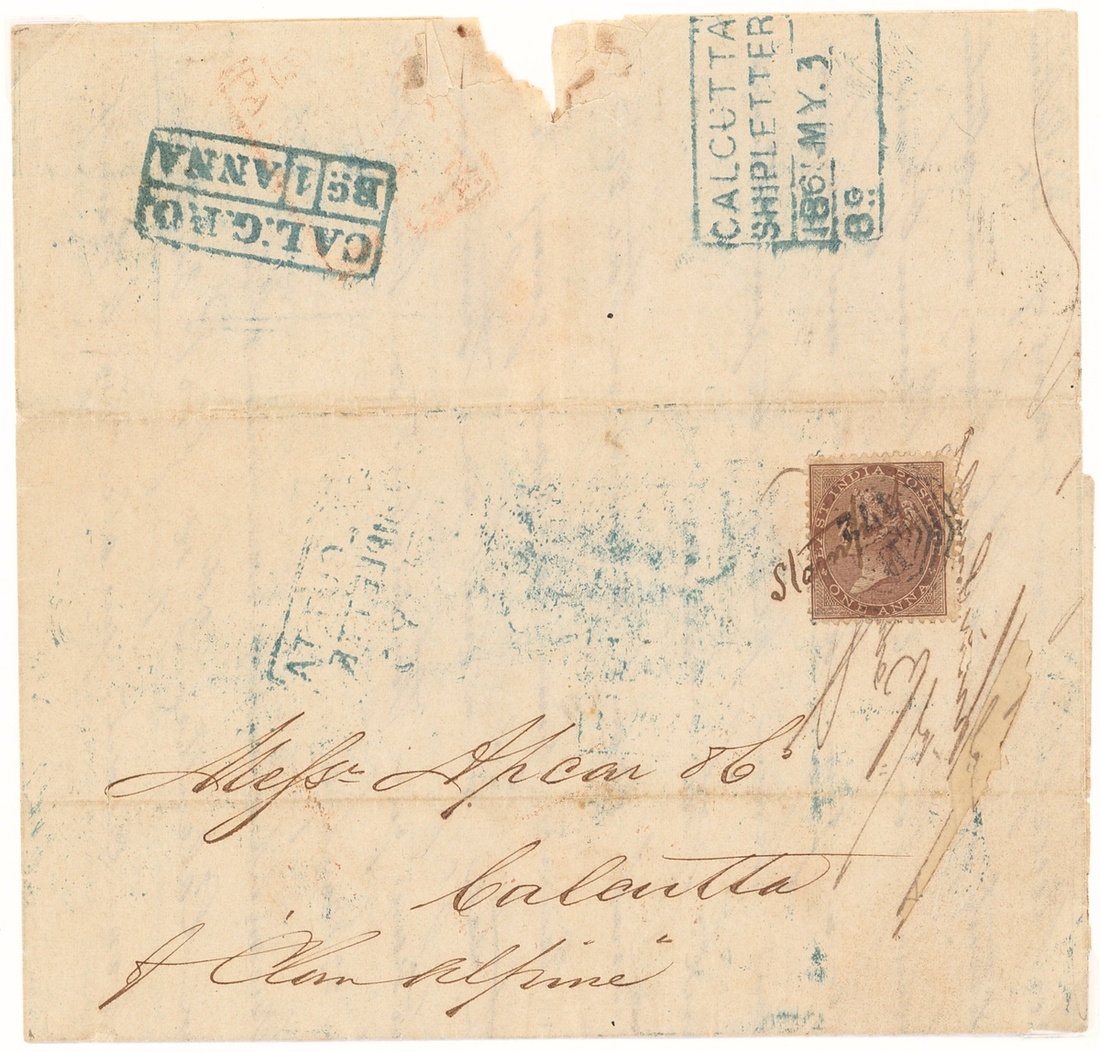 1865 (24 Apr.) entire letter to Calcutta, marked "p Clem Alpine", bearing 1865 1a. tied by manuscript "stamped", cancelled by "B/172" obliterator and showing, on reverse, legible framed