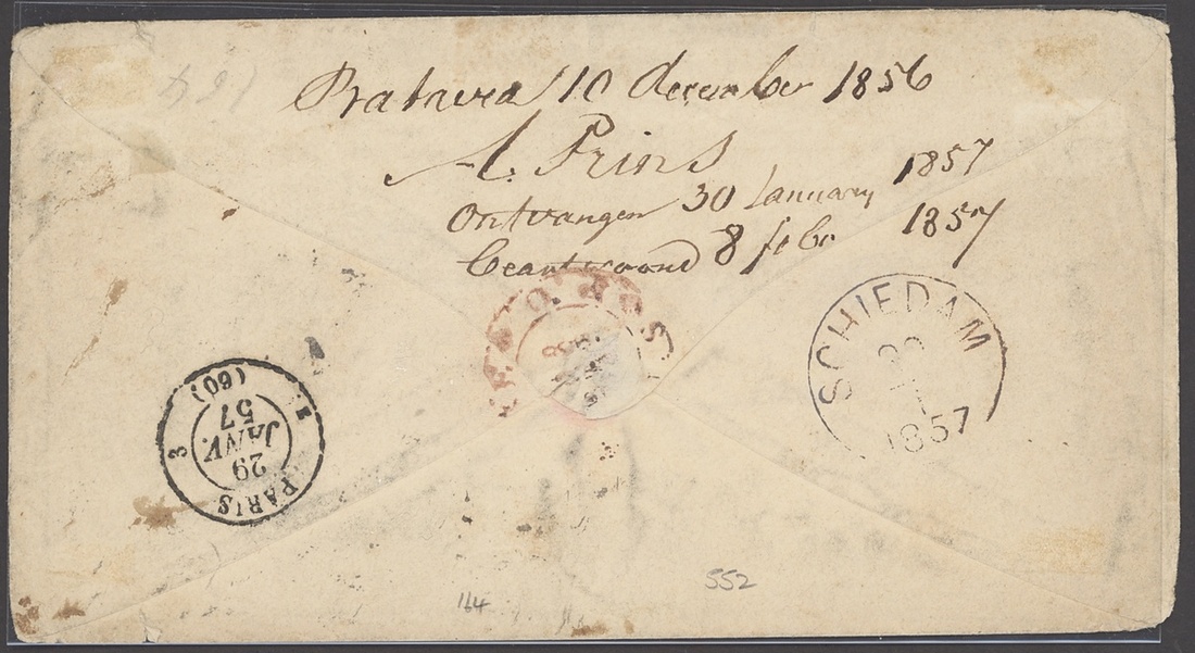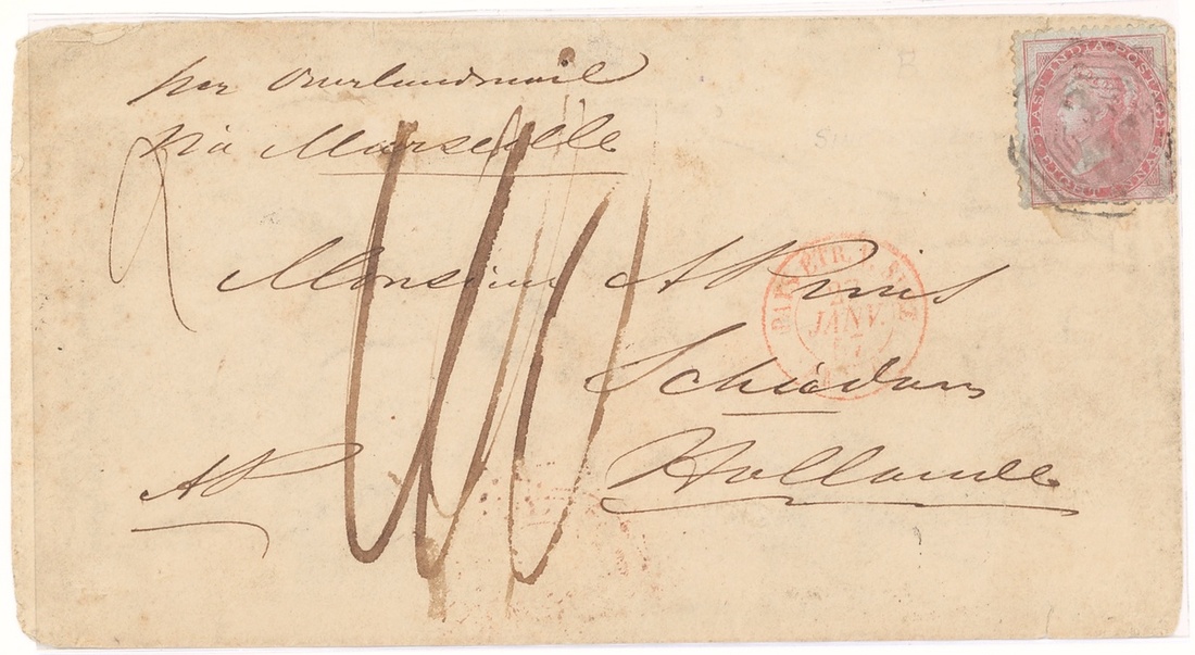 1856 (10 Dec.) envelope to Schiedam, endorsed on reverse as from Batavia, marked "per overland mail via Marseilles", bearing 1855 8a. on blued paper tied by "B/172" obliterator, showing manuscript "1/10" and, on reverse,