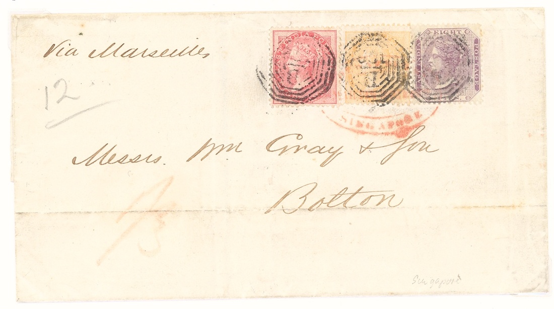 1865 (14 Aug.) entire ex the Gray correspondence to Bolton, marked "Via Marseilles", bearing 1865 8p., 2a. and 8a., all tied by Martin Dyce & Co. firm's oval chop in red and cancelled by "B/172" obliterator, showing red crayon "1/3" and, on reverse across join,