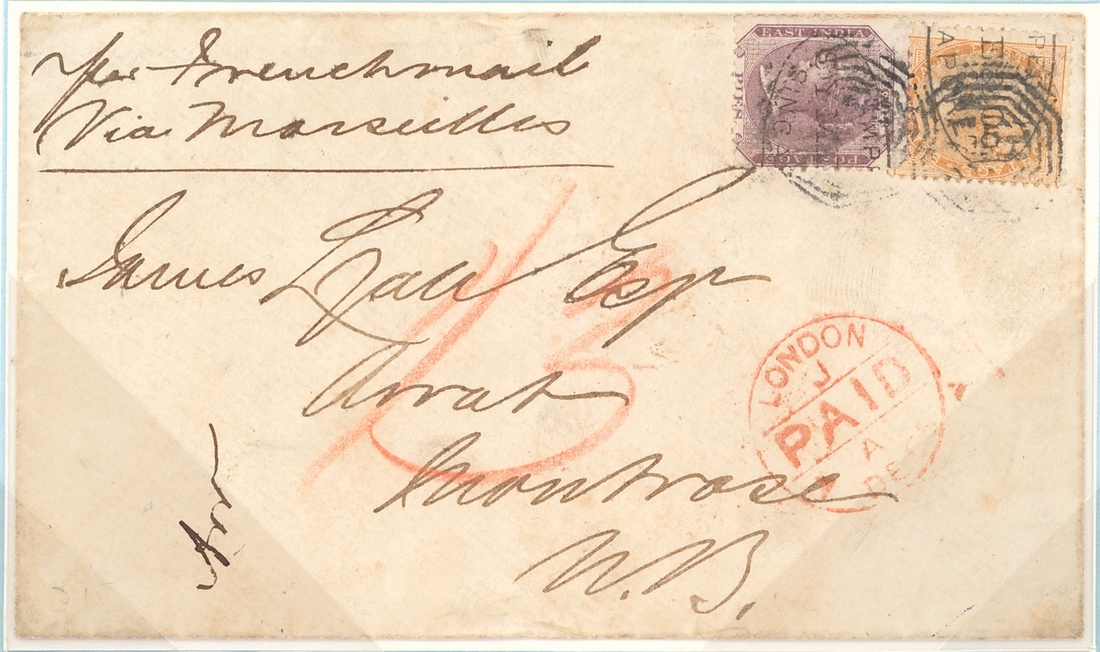 1865 (Nov.) envelope to Montrose, marked "per French mail via Marseilles", bearing 1865 8p. and 2a. pre-cancelled with part Syme & Co. firm's chop and tied by "B/172" obliterator, showing red crayon "1/3", London Paid transit d.s. (7.12) and, on reverse, light
