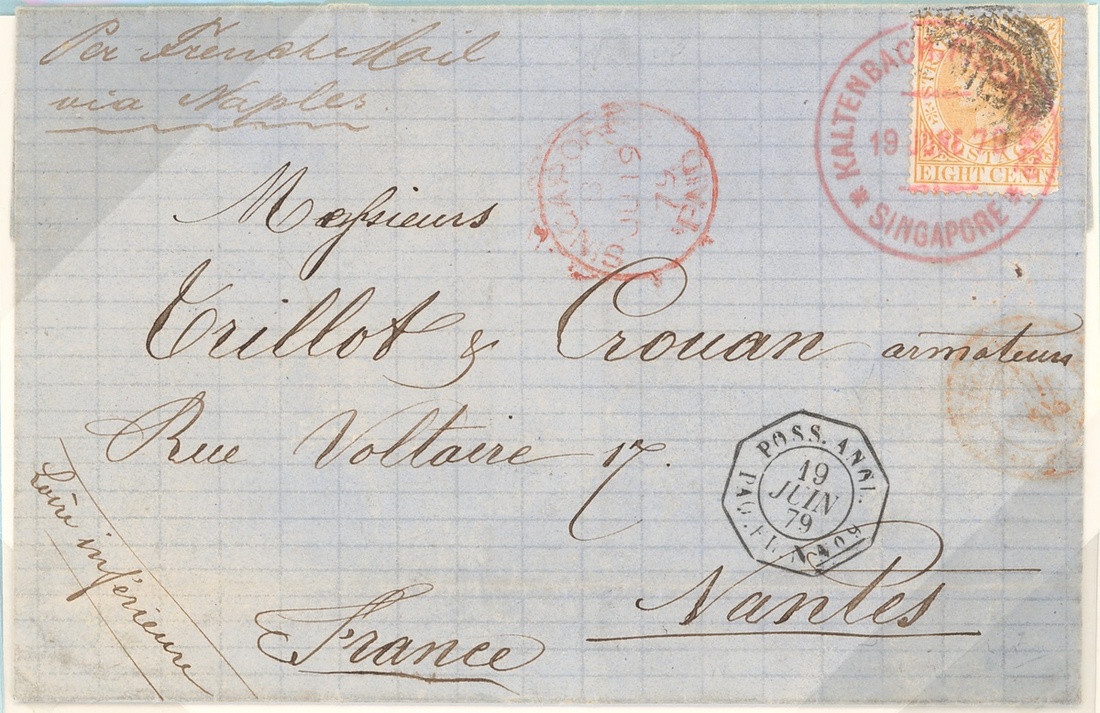 1879 (19 June) entire from Singapore to Nantes, marked "Per French Mail via Naples", bearing 8c. tied by circular Kaltenbach Fischer & Co. firm's chop in red and poor "B/172" obliterator, showing