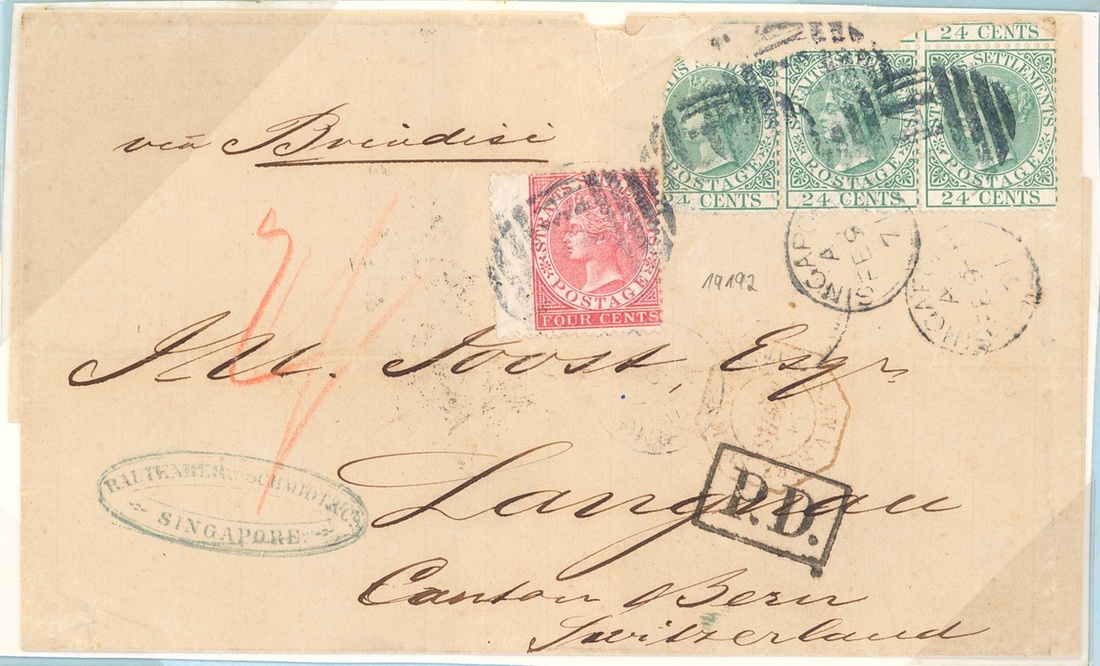 1871 (6 Feb.) double rate entire from Singapore to Langnau, marked "via Brindisi", bearing 4c. and 24c. strip of three (two defective), all tied by "D14" duplex, showing red crayon "2/-", framed