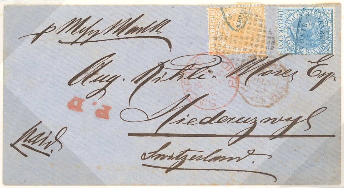 1875 (4 Feb.) envelope from Singapore to Niederuzwil, marked "p Mess Maritimes", bearing 8c. and 12c. both pre-cancelled with part firm's oval chop in blue, the 8c. tied by dumb obliterator, the 12c. uncancelled, showing