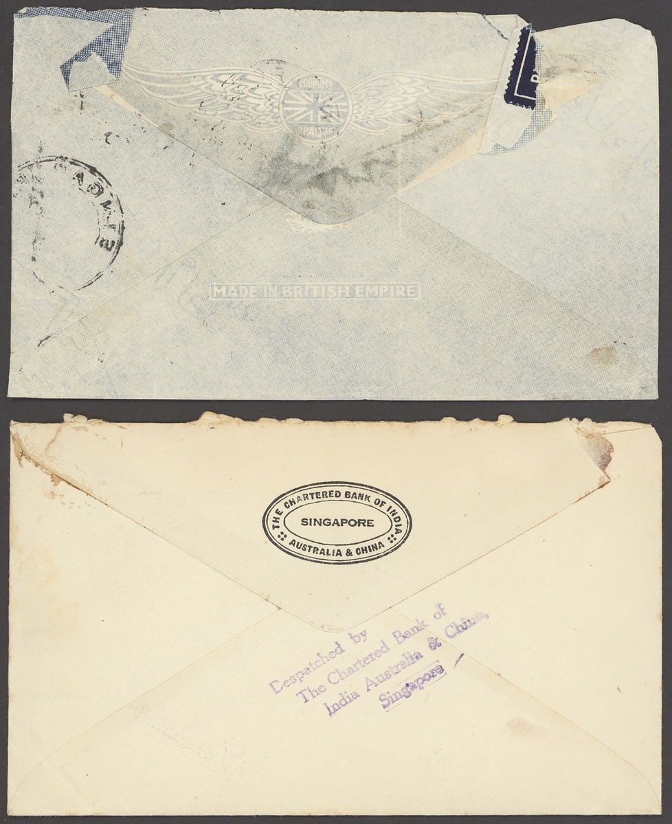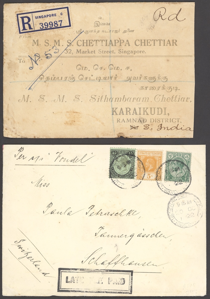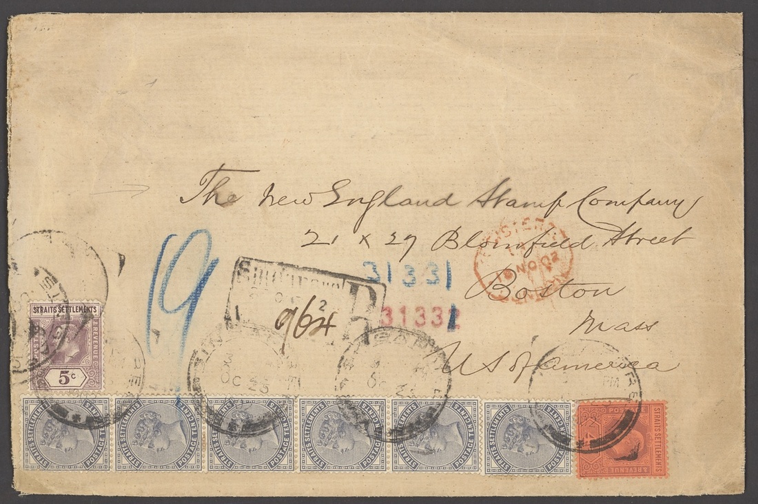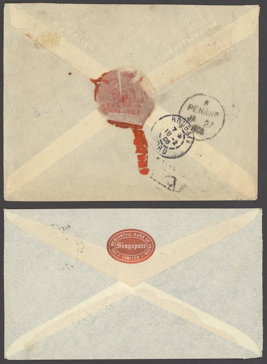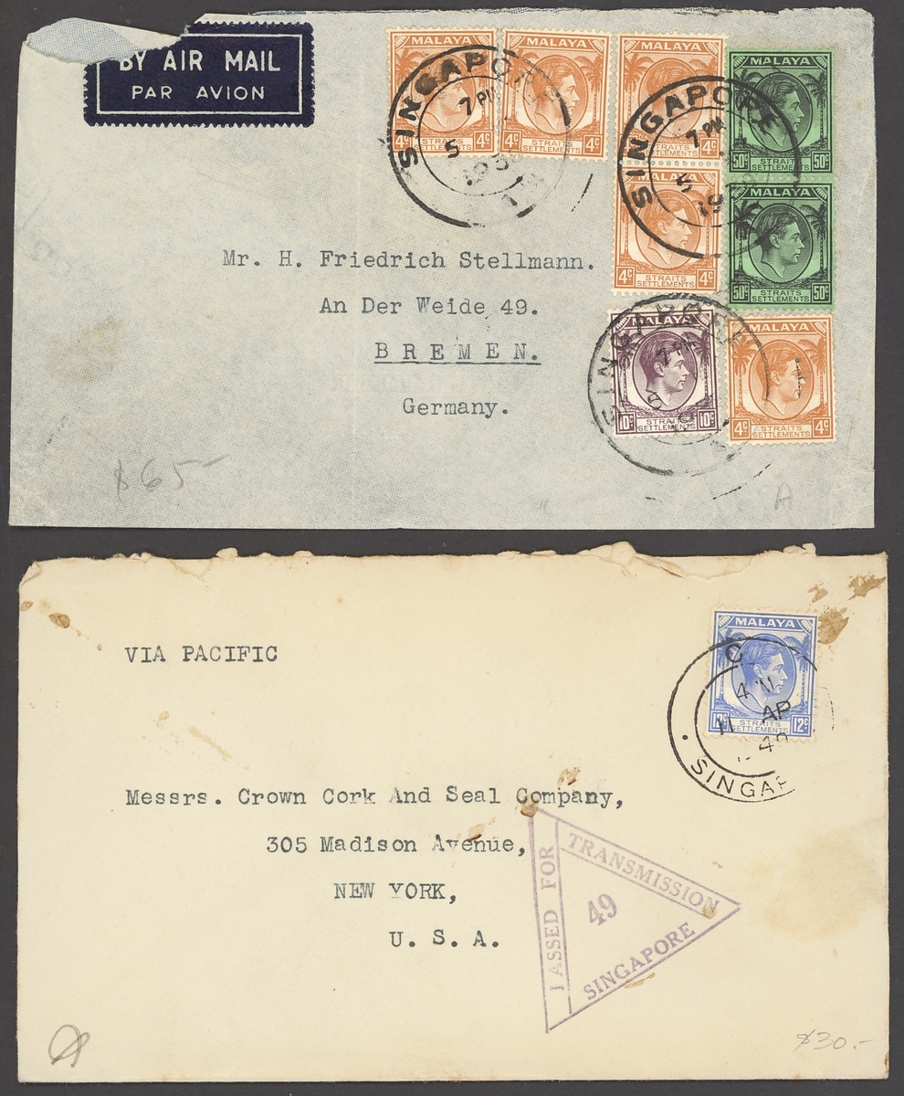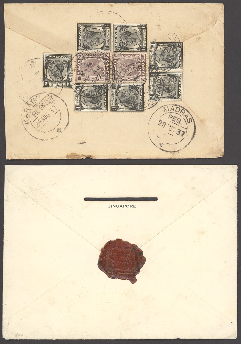 1904-45 envelops (33, seven registered; including two Cinematograph Pathé and a Wearne Bros firm's), picture postcards (3, one from Labuan but with poor cancel) and a large piece, variously addressed including to Dutch East Indies, France, Germany (3), India (3), Indo-China, North Borneo, Switzerland, Thailand (2) and USA, showing a range of frankings including 3c. (2), 4c. (3), 8c. (4), 13c. (2, registered), 14c. (registered), 18c. (2, registered), 25c., 34c., 52c. and 69c. (registered), condition rather mixed